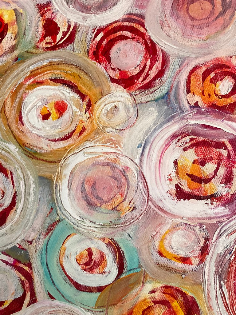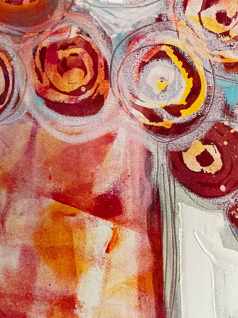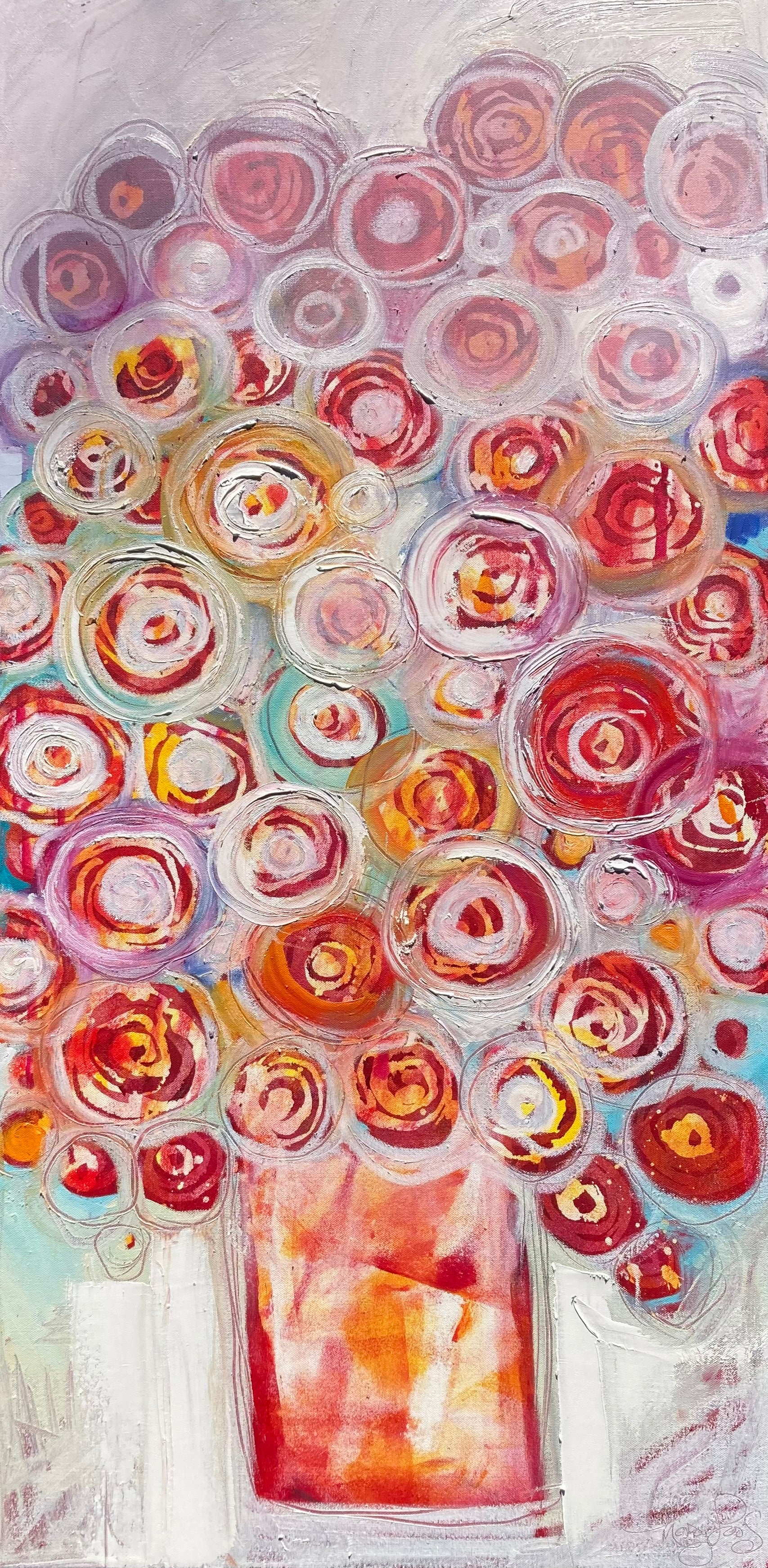 Dream Big is an original oil paintings of a large and exuberant potted floral. Created with an abundance of energy, Dream Big is big on texture and colour, even the boundaries of the canvas overflows with blossoms.