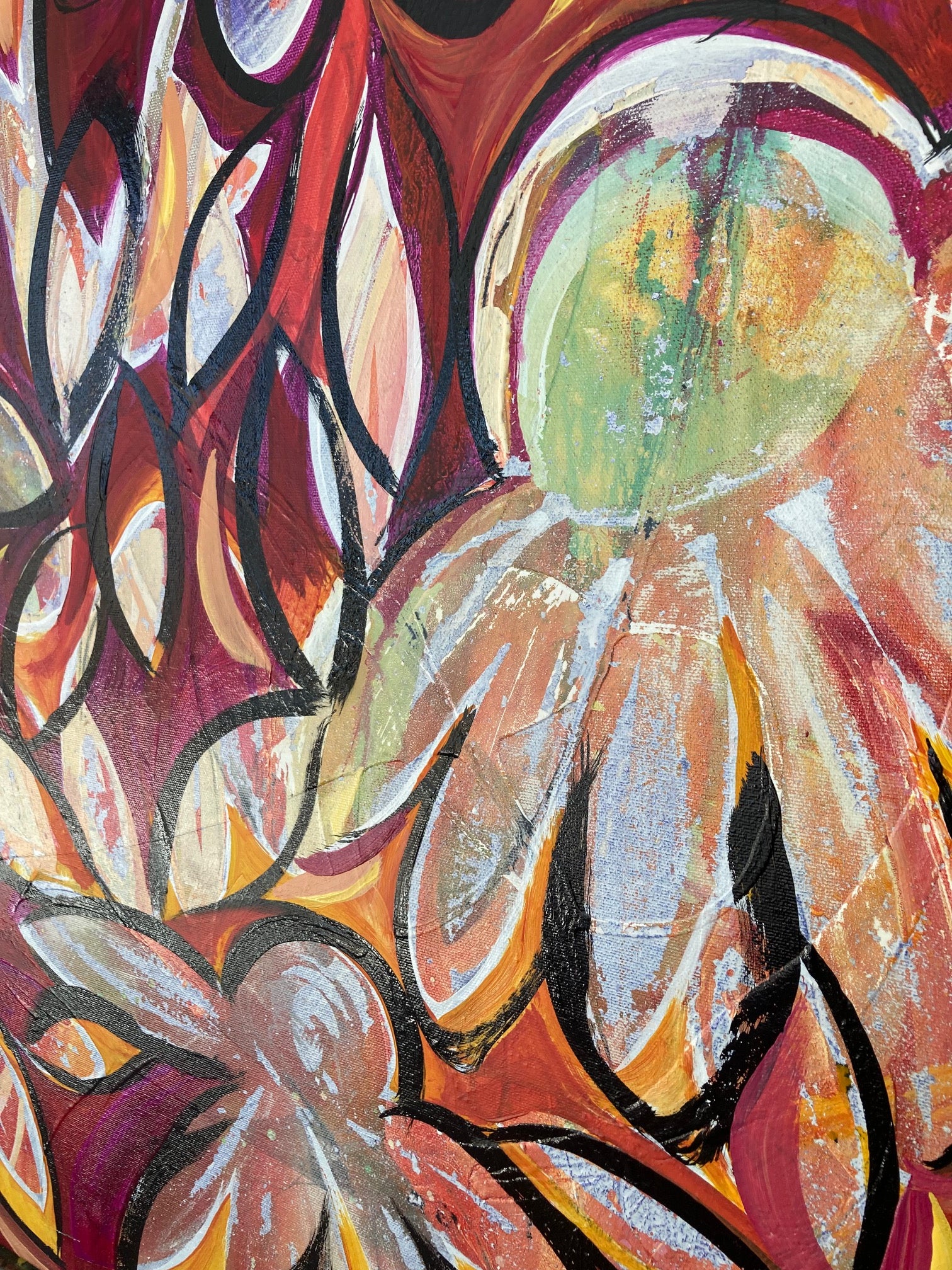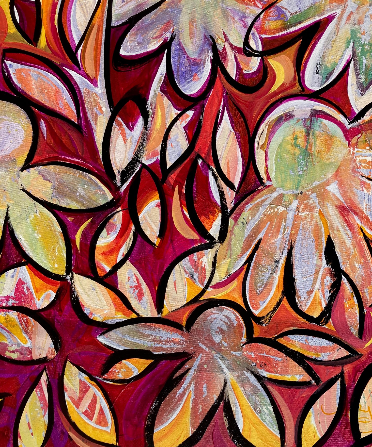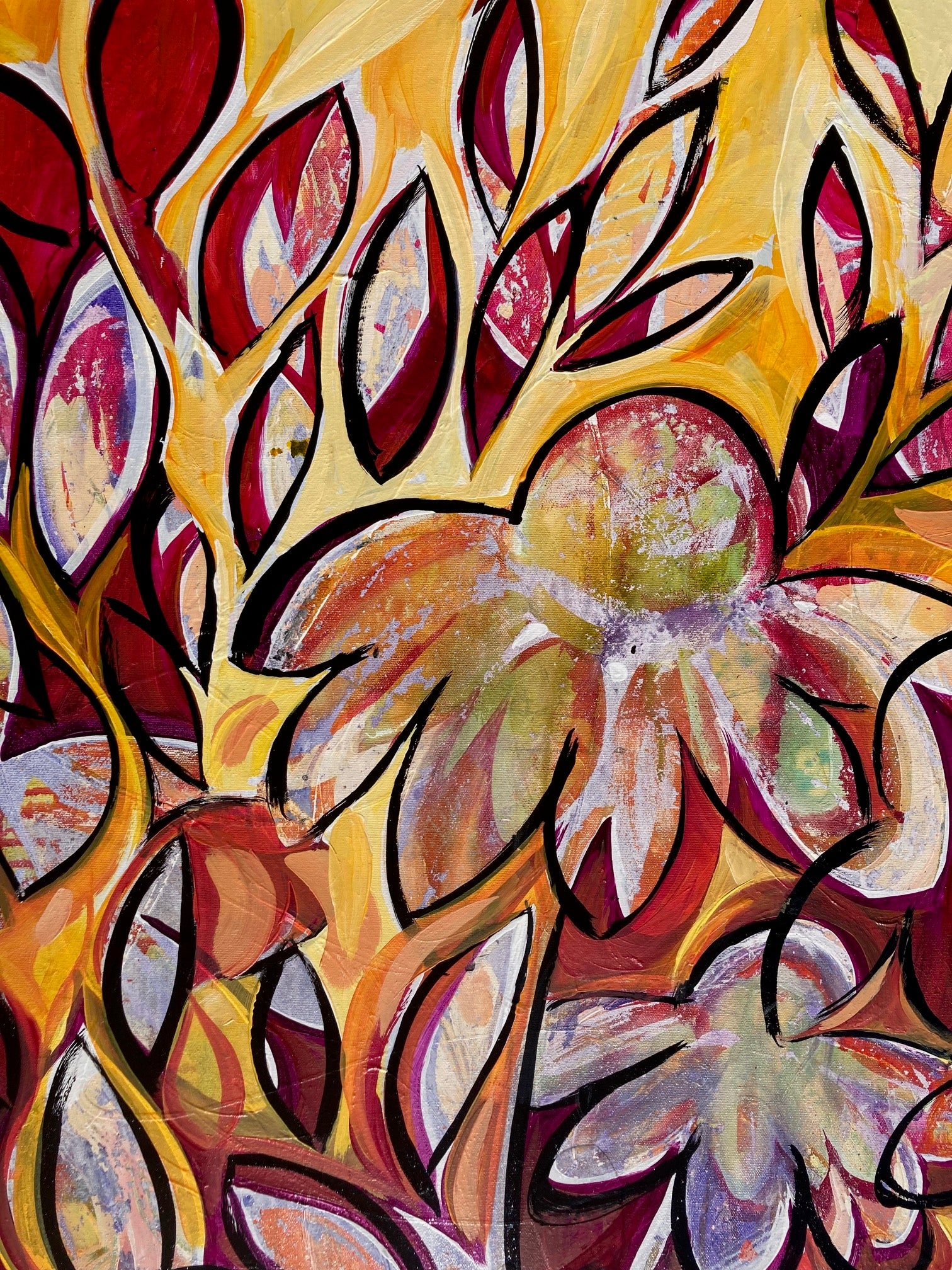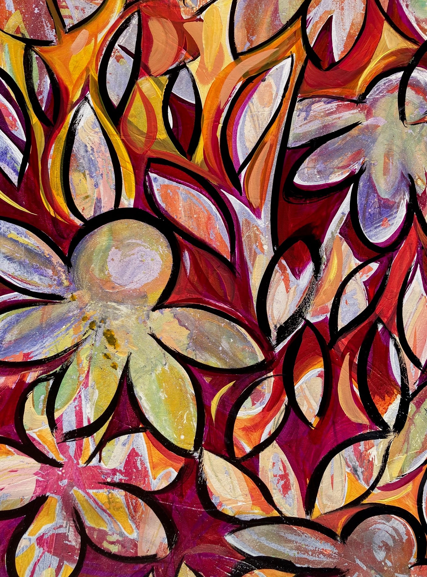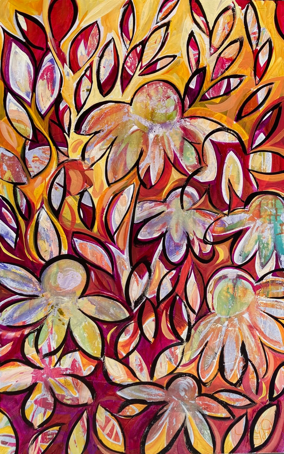 The painting formally called End of Summer Flowers has a new life I'm renaming Flower Child. Caution has been thrown to the wind and what was once an attempt of faded blooms now has a fire that won't be ignored. Flower Child has an energy and colour combination radiating warmth. Made in Canada.