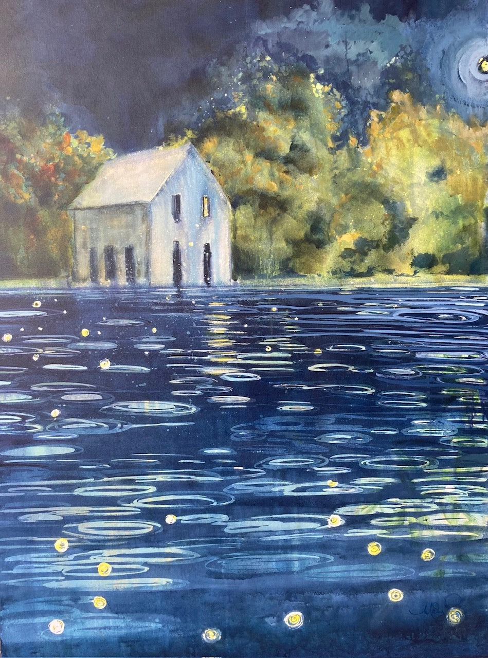 Evening Glow is an original painting of the lock master's house that sits along the Rideau Canal in Merrickville Ontario. Fireflies are performing their magic ritual over the river. The realistic edges are blurred in this original acrylic painting.