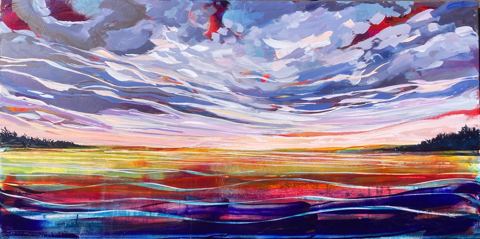It just so happens I was listening to Blue Rodeo while painting this original artwork and the lyrics for "Hasn't Hit Me Yet" hit me and I felt it. This painting took me on a journey. It started off as a quiet river painting in gentle blues and creams evolved into something very dynamic and multicoloured. I brought it back to a striking yet harmonious state after it ventured off into a full on colour riot.