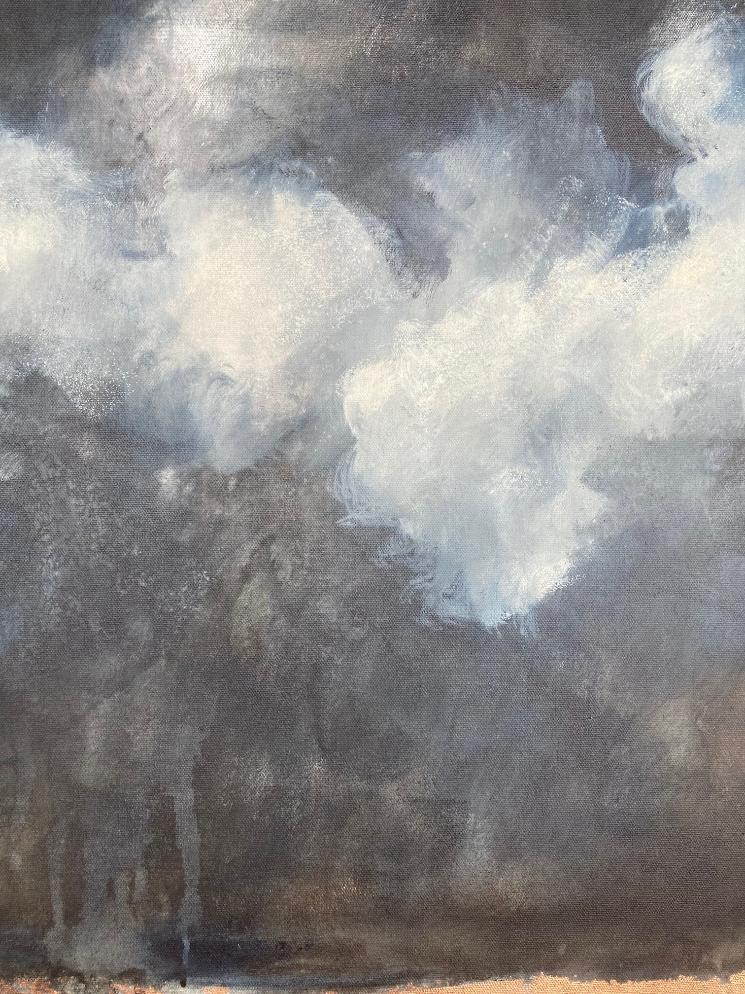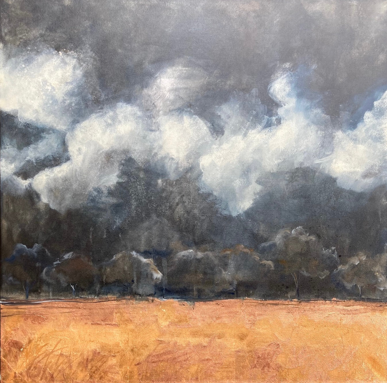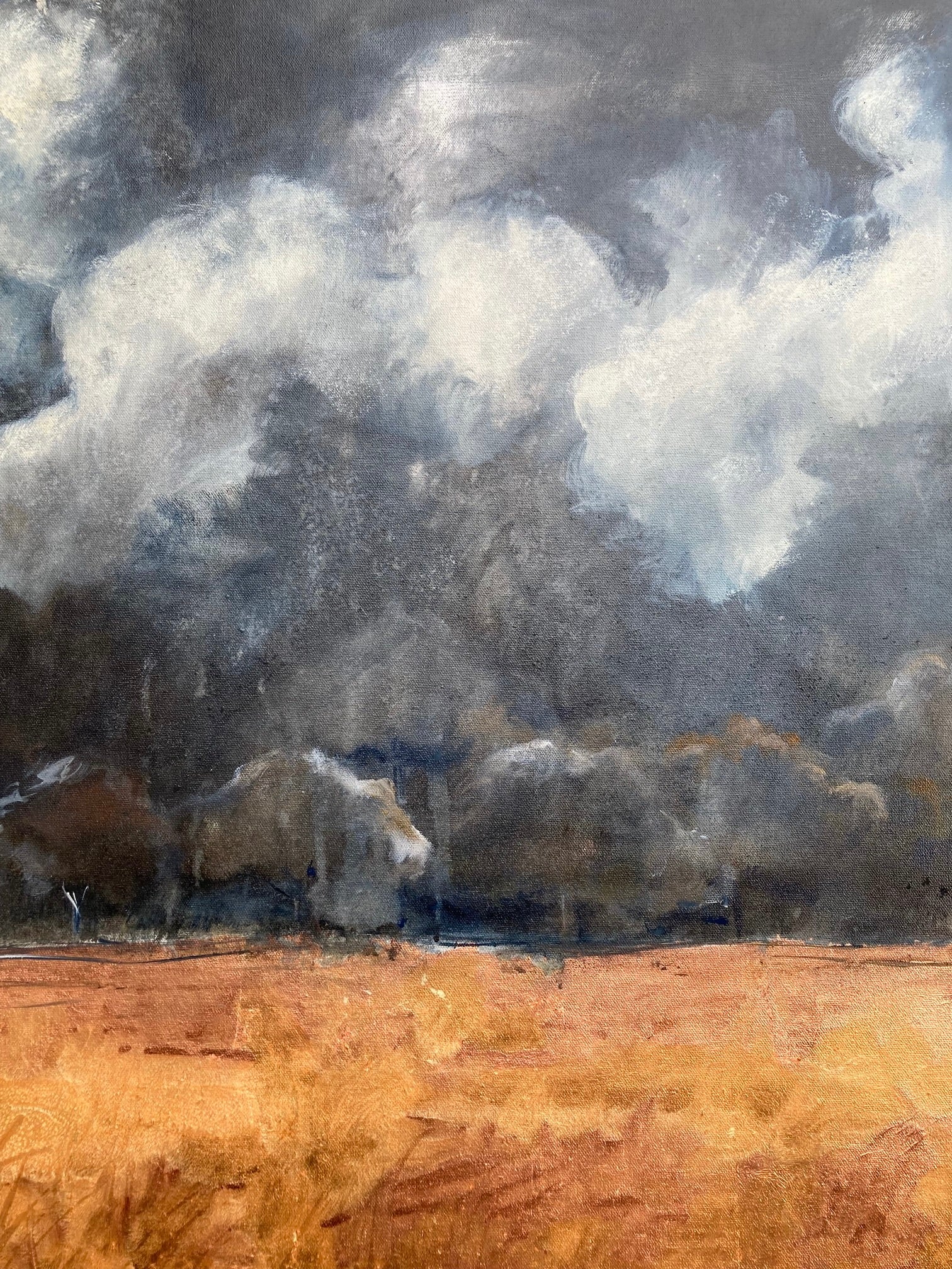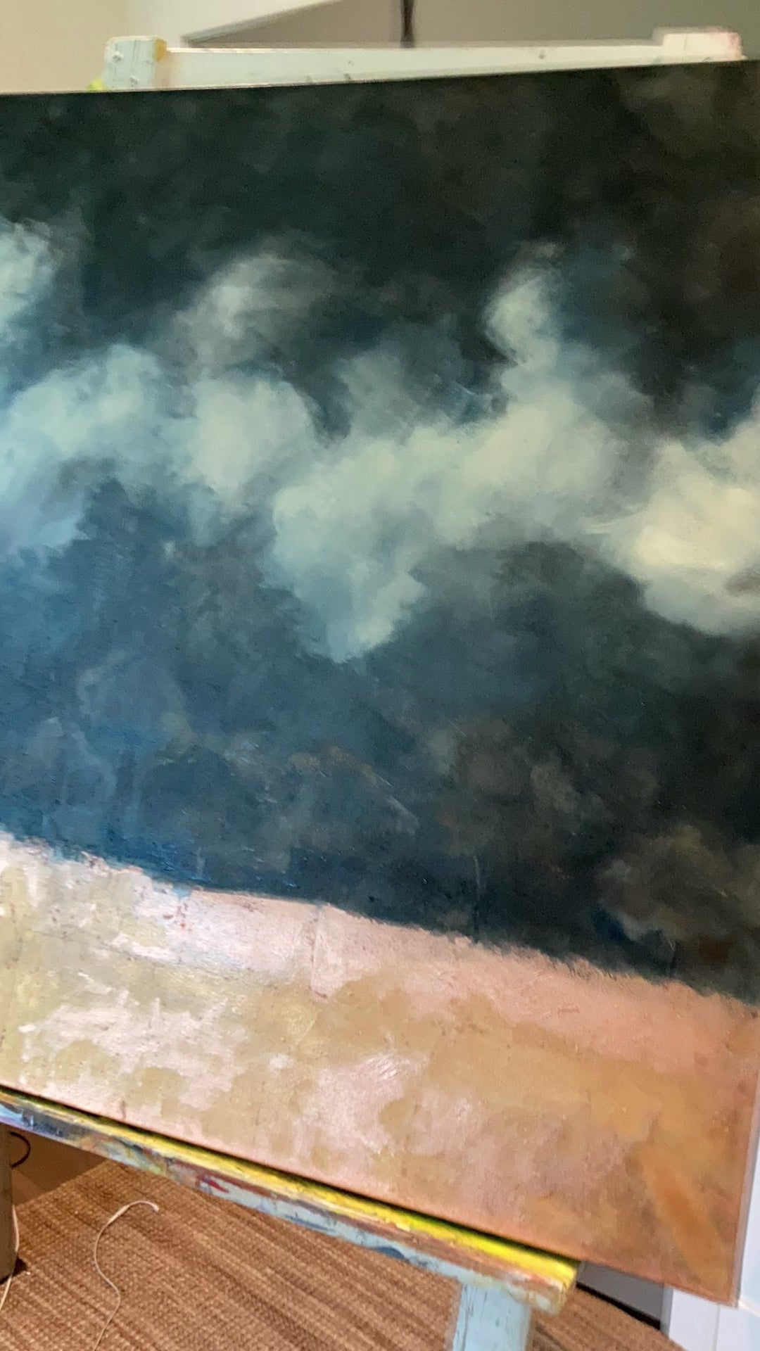 There's just something about a dramatic sky and a glowing field that captures my eye. I feel comfort in days like this. Horizon is an original painting of an ominous dark sky with cloud wisps playing about. The copper and gold foreground provides an interesting, glossy and reflective contrast.