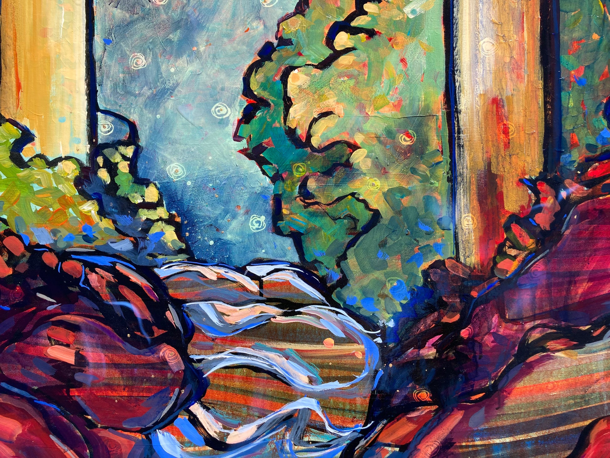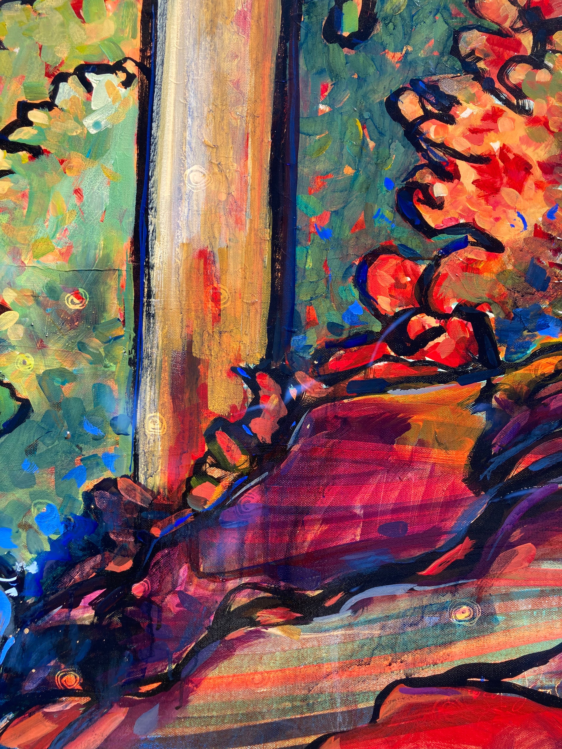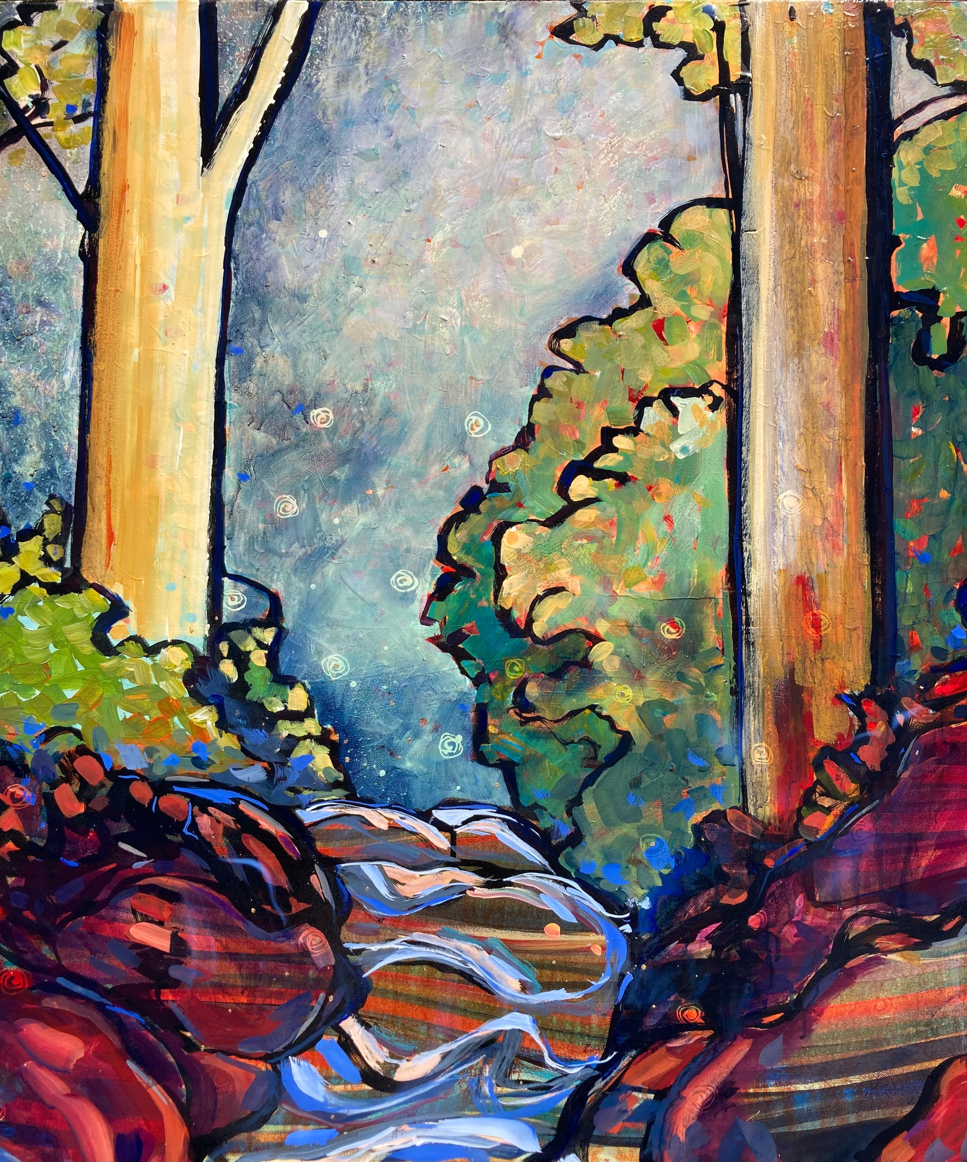 "Let's Go" is an original stylized landscape acrylic painting. This one is 48 x 36 inches of vibrant colour and energy of a little stream running through the forest. Let's Go was a joy to paint and maybe it takes you to a happy place too. I've added a little sparkle with fireflies and finished it all with a bit of texture and glossy topcoat. Let's Go will be a beautiful focal point in your living or office space, complete with a little magic.