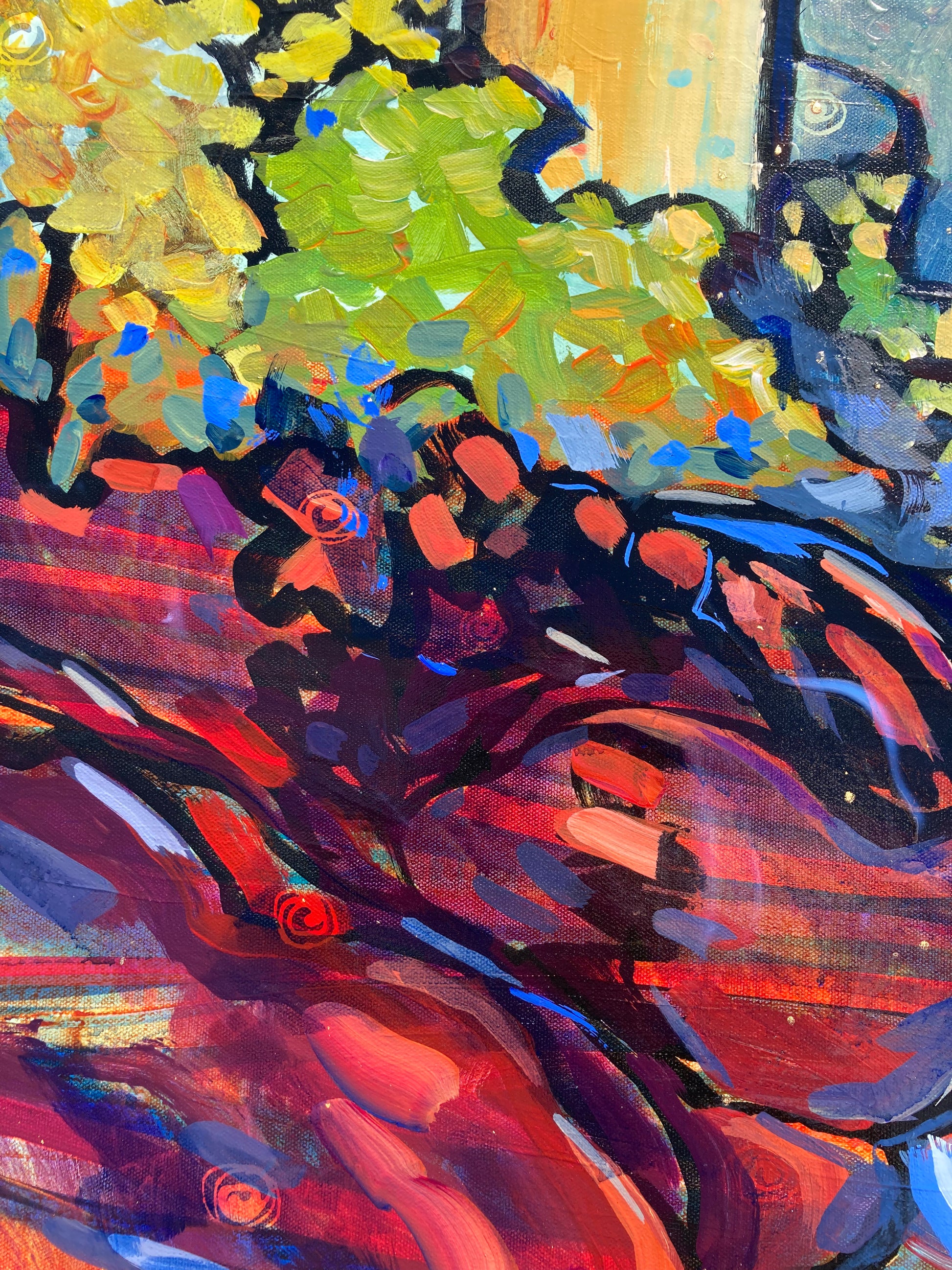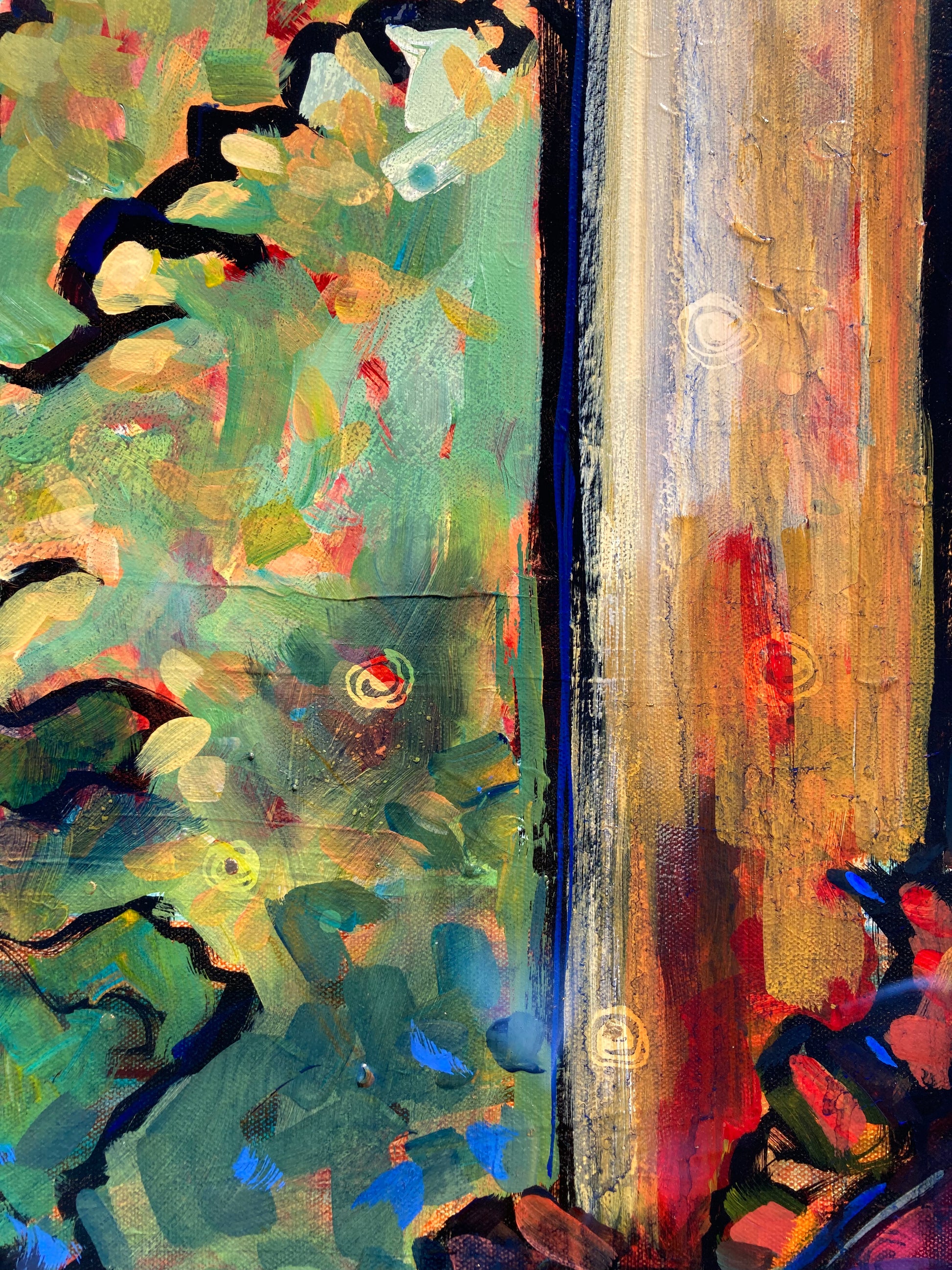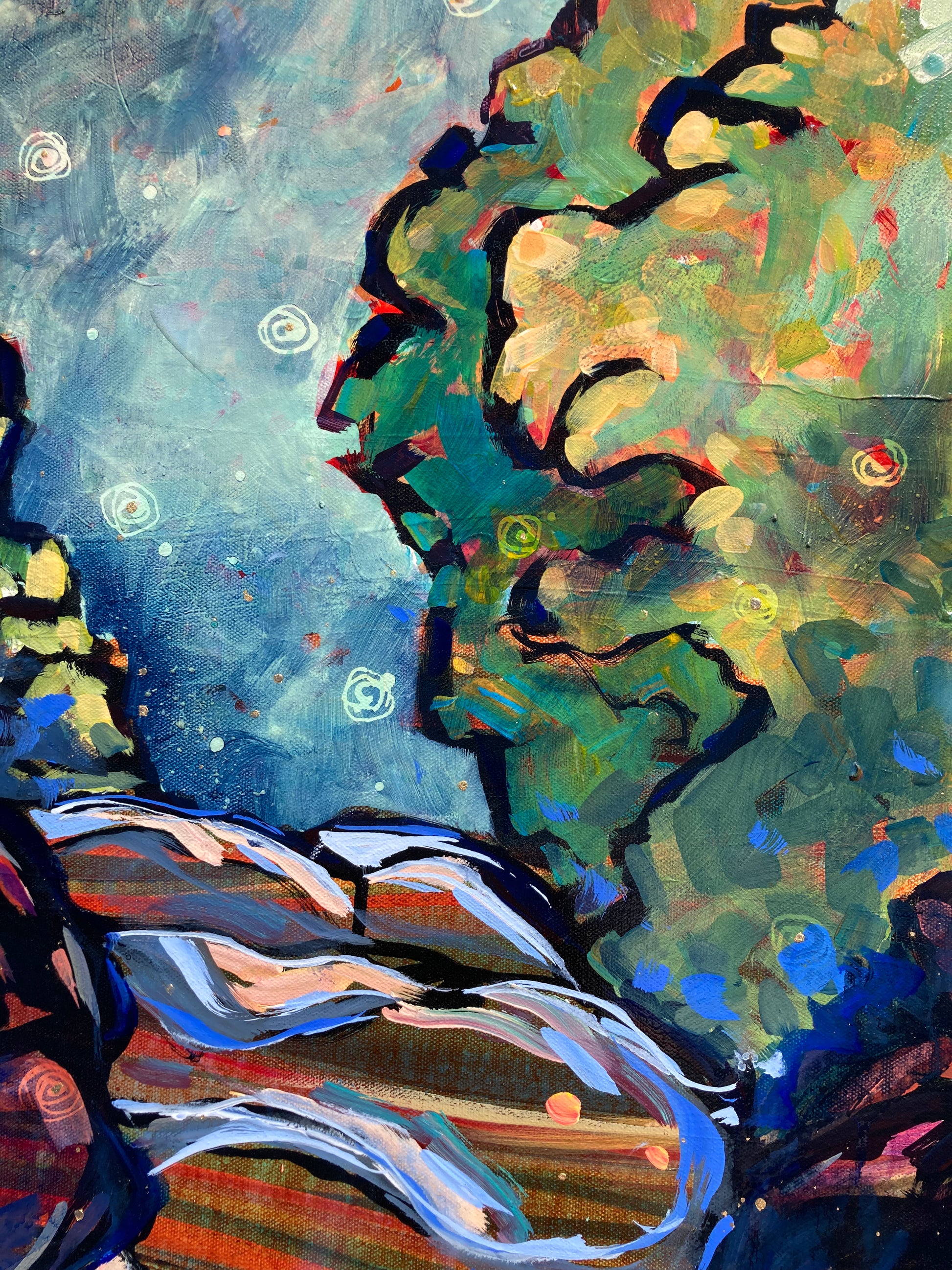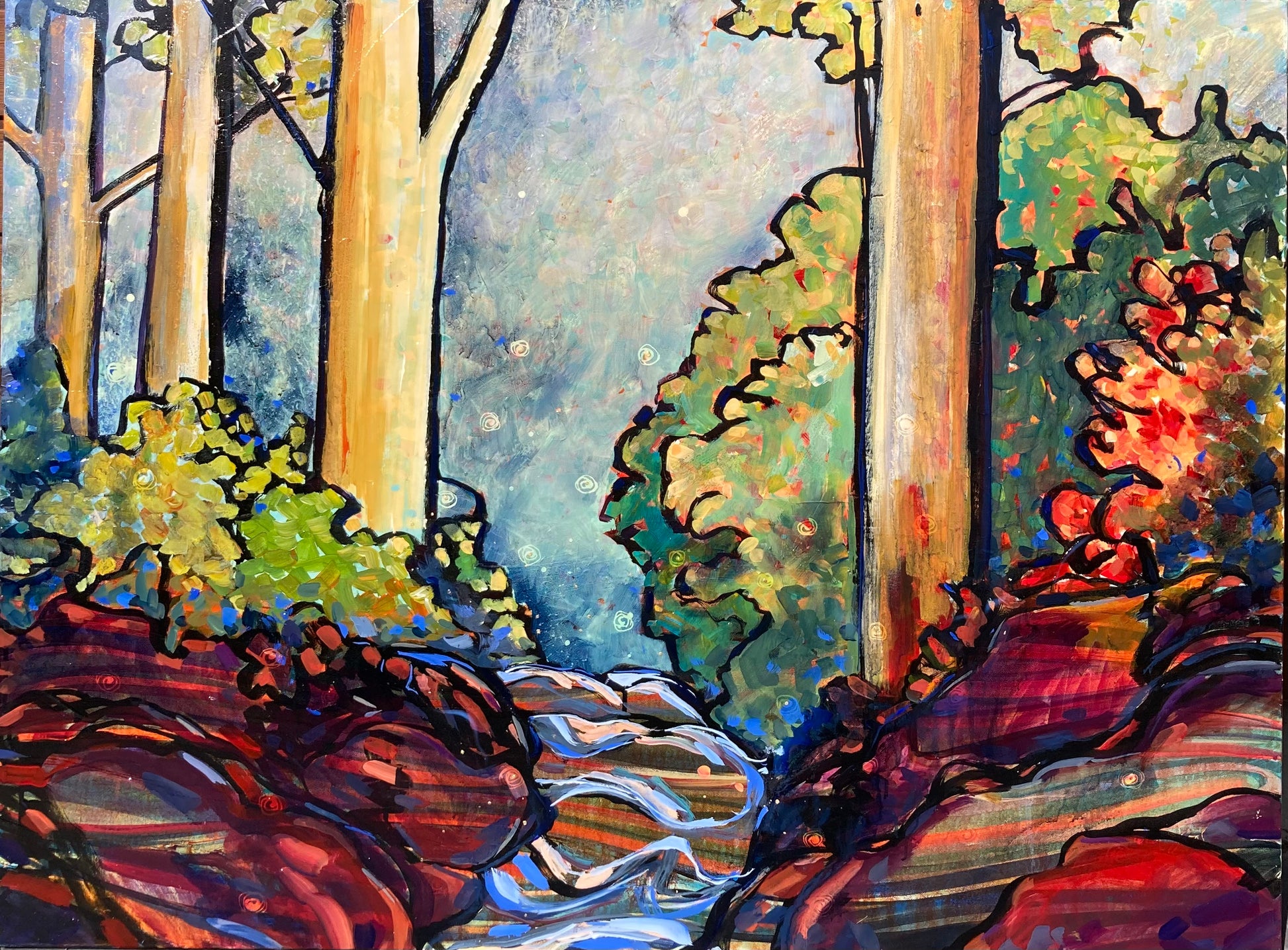 "Let's Go" is an original stylized landscape acrylic painting. This one is 48 x 36 inches of vibrant colour and energy of a little stream running through the forest. Let's Go was a joy to paint and maybe it takes you to a happy place too. I've added a little sparkle with fireflies and finished it all with a bit of texture and glossy topcoat. Let's Go will be a beautiful focal point in your living or office space, complete with a little magic.
