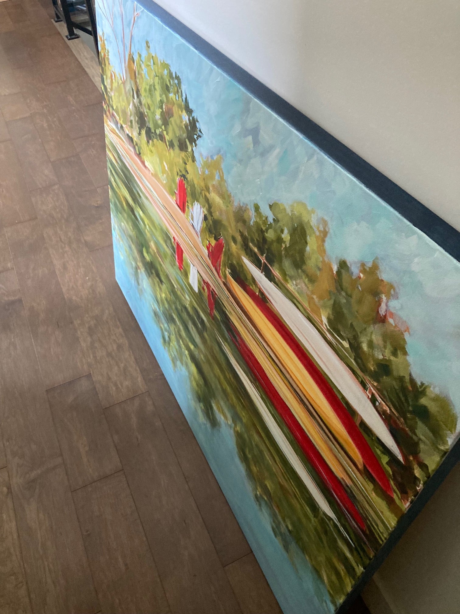 This original painting is on a 48 x 36 stretched gallery canvas with 1.5 inch sides A satin vanish top coat adds UV protection of the artwork.