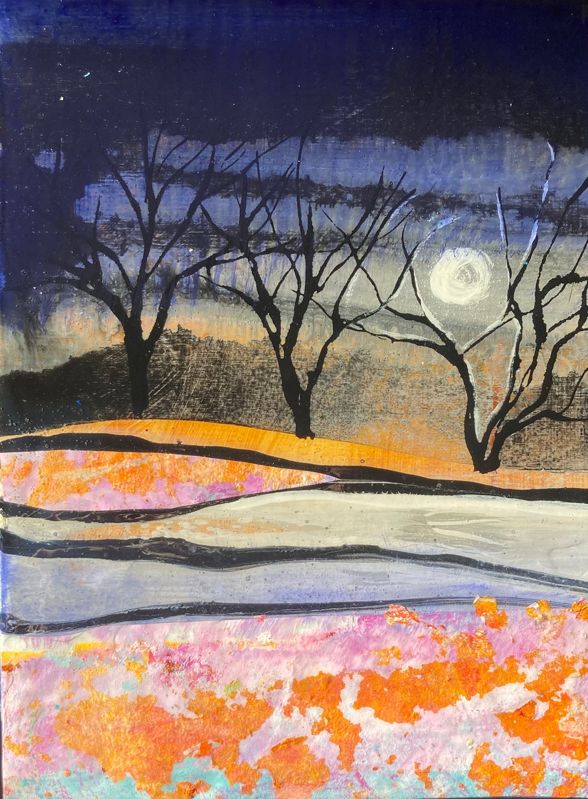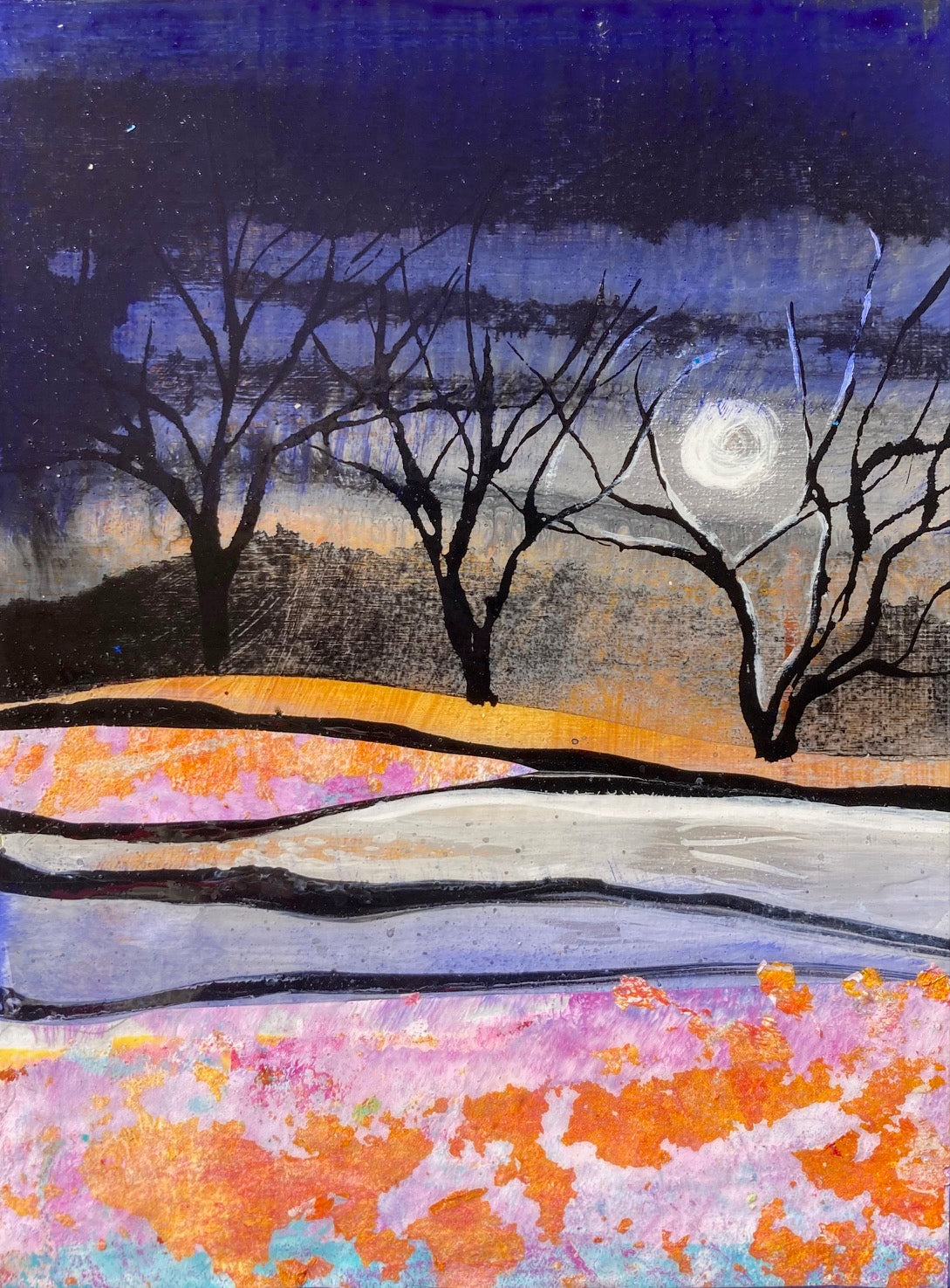 The aurora reflects off the snow covered field in this peaceful night scene painting. A moon hangs low and peeks between branches.