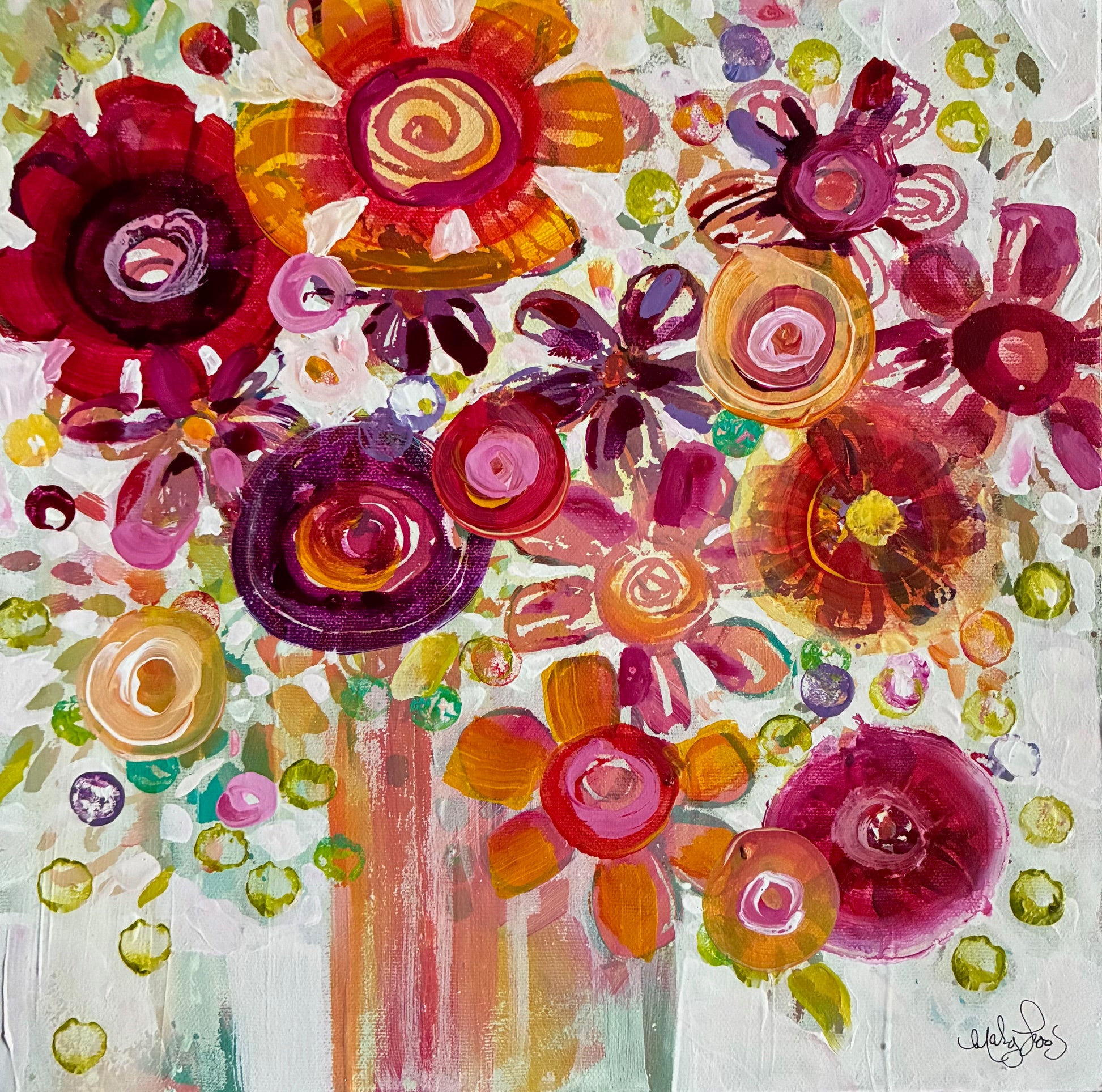 Painting Happy is an original acrylic painting created on a 12 x 12 stretched gallery canvas. The style is impressionistic and full of joy.