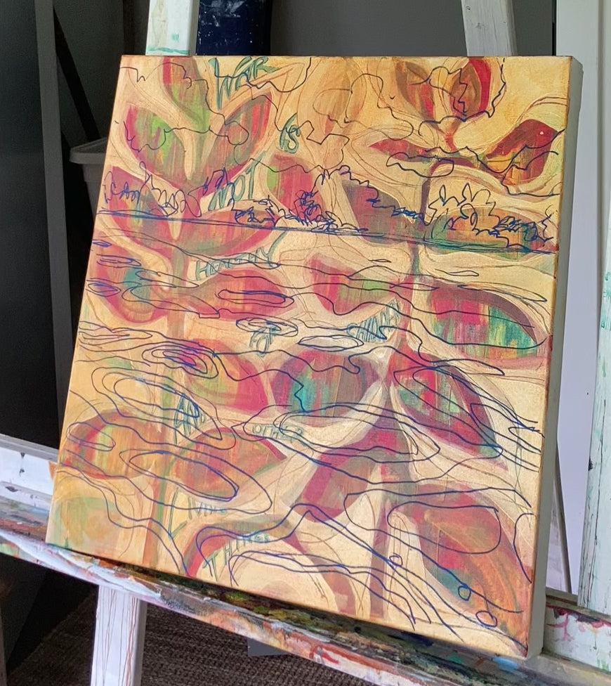 Rolling on the River is a playfully reflective original painting on a 20 x 20 inch stretched gallery canvas. The underpainting plays a big part in the creativity of this one of a kind.