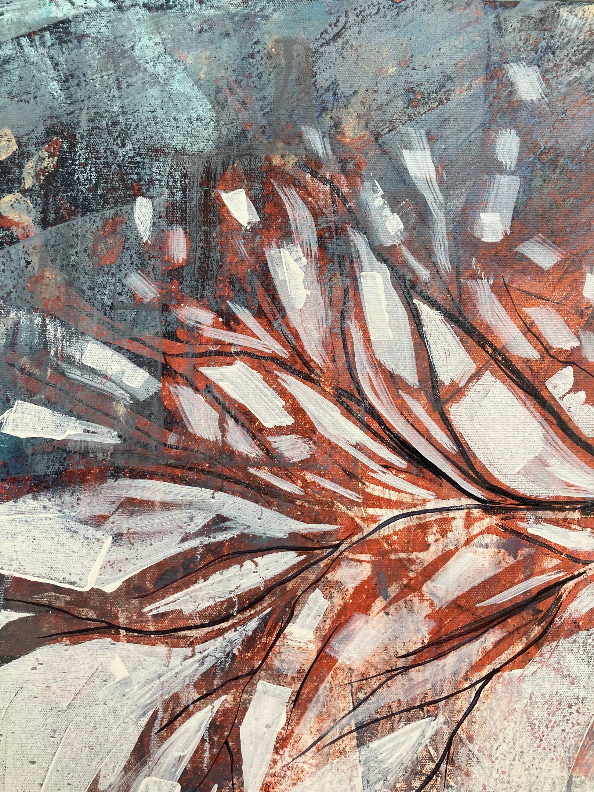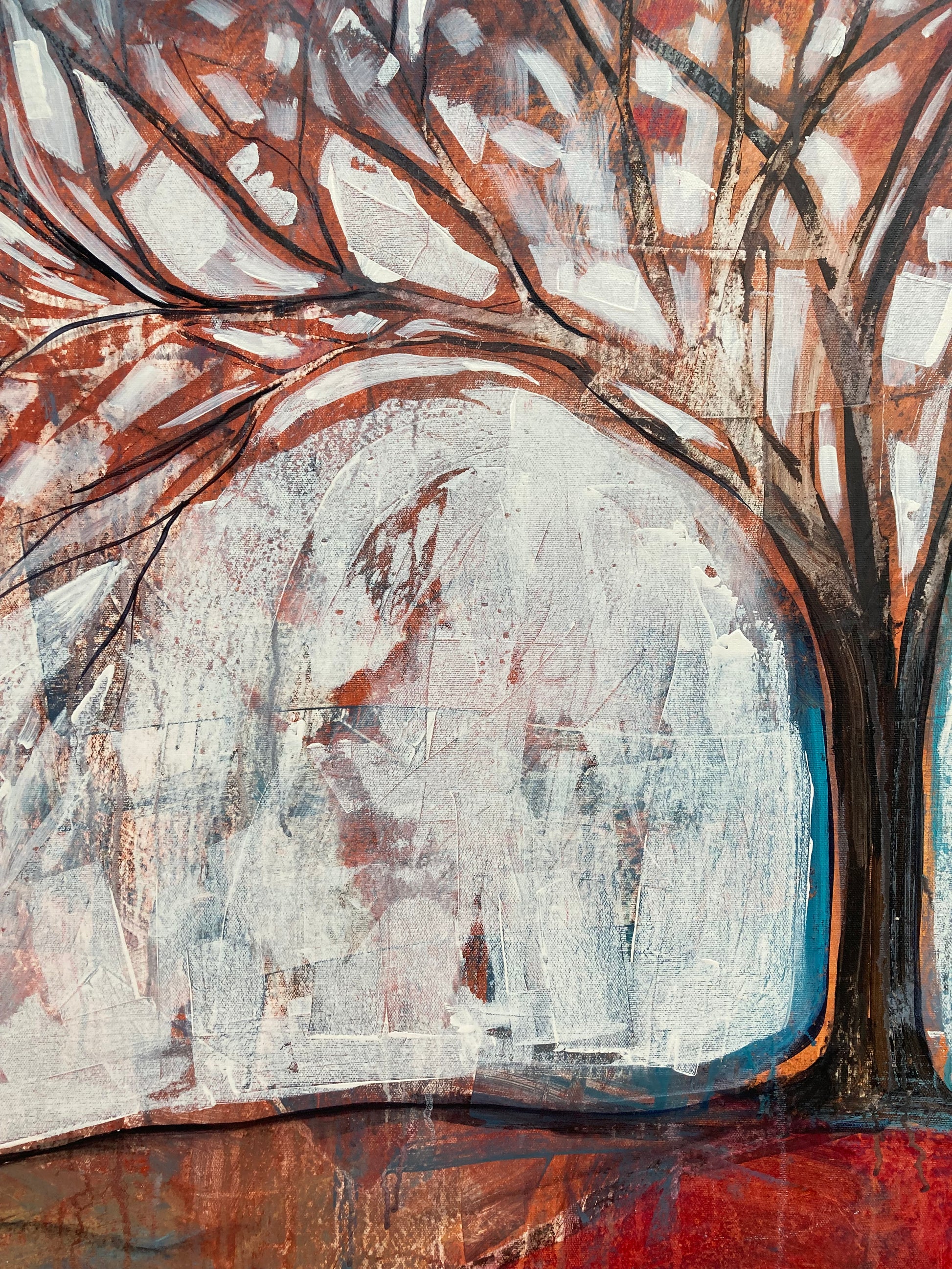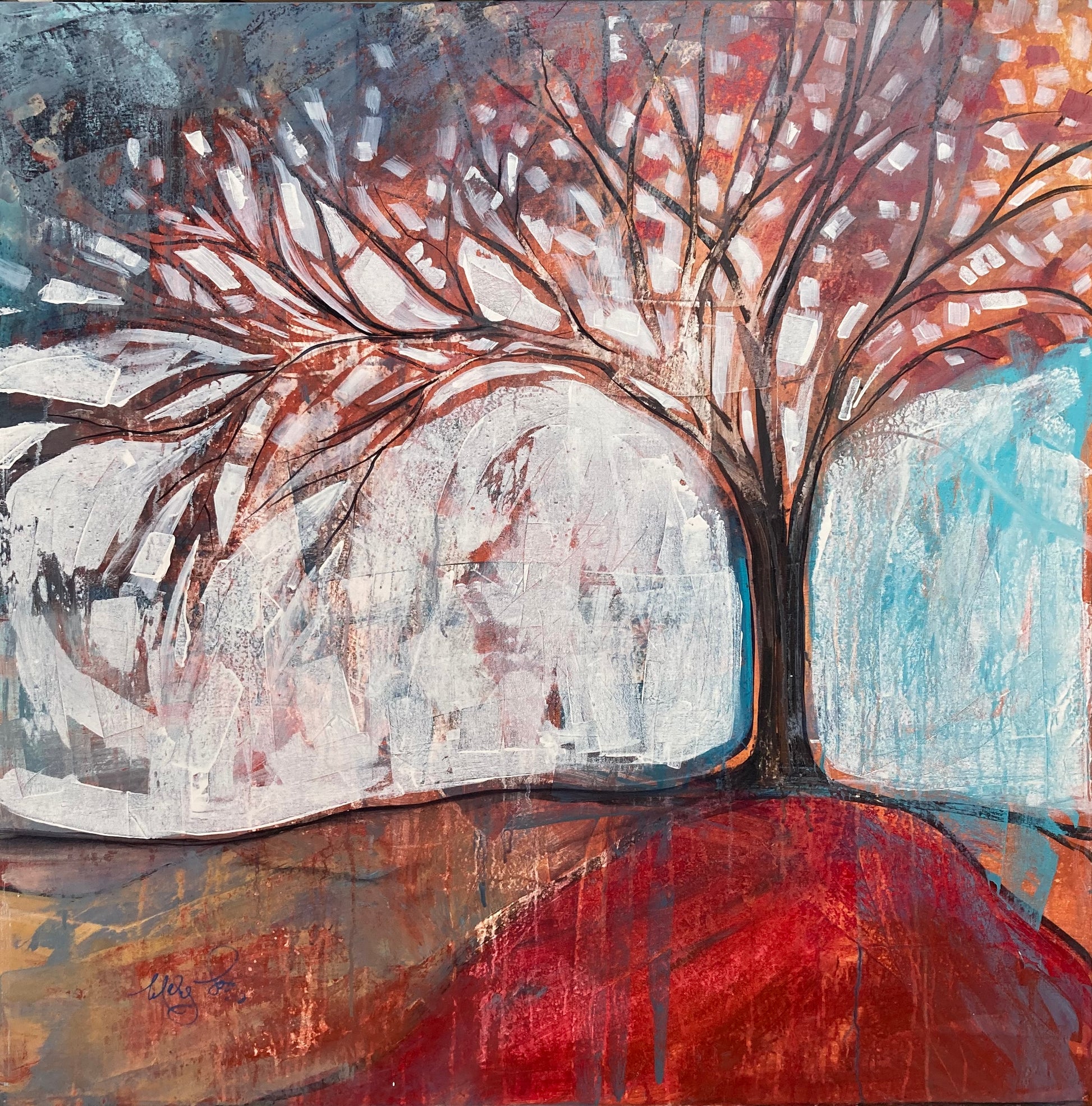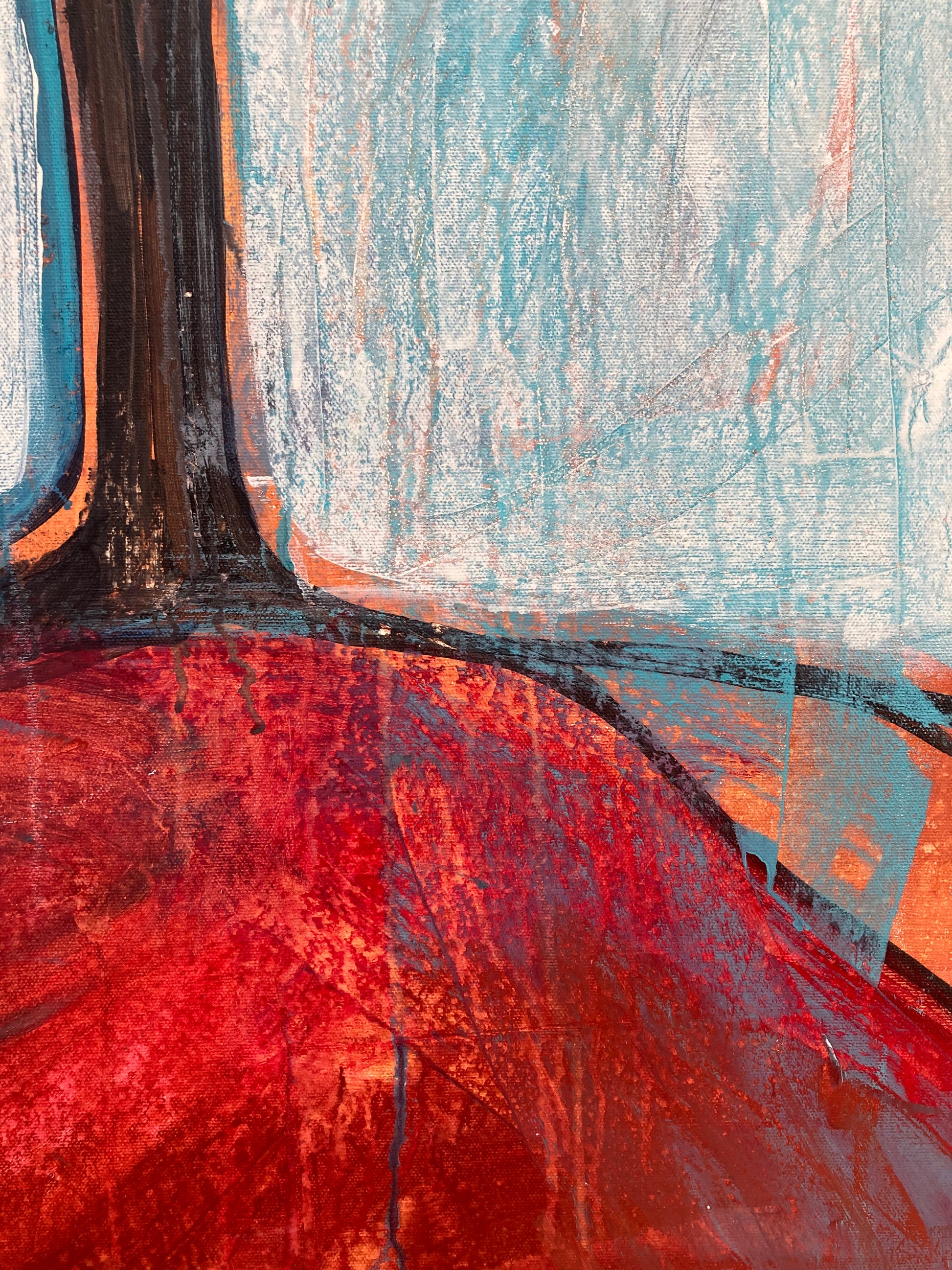 Sanctuary is nod to the beautiful old trees still living in the parks and road sides. This painting was one the last I created and represents the way I felt getting ready for the summer show during a heat wave. All of the daily painting made me feel free in my approach and this one was painted with gusto. The painting is done in acrylic on a 36 x 36 inch gallery canvas.