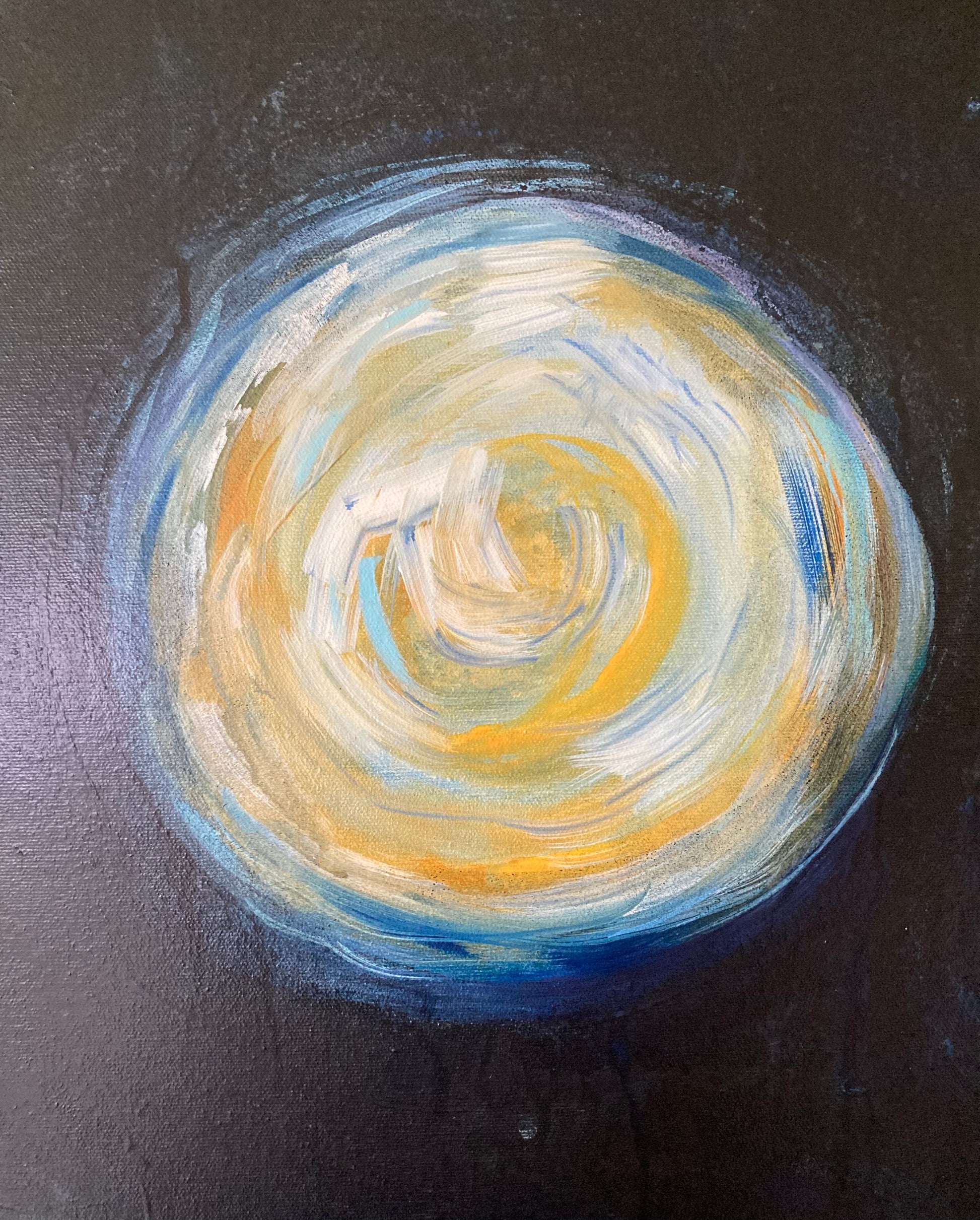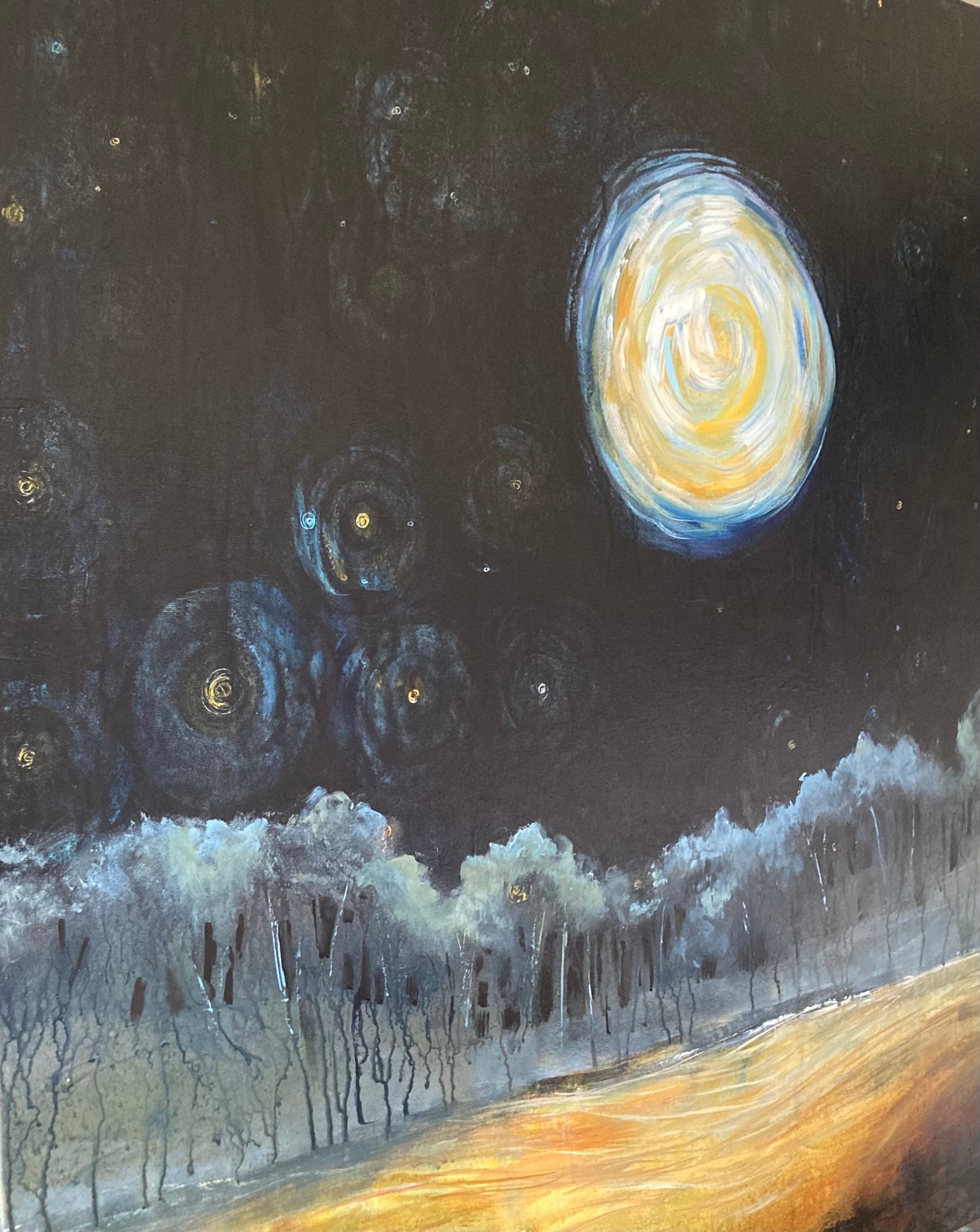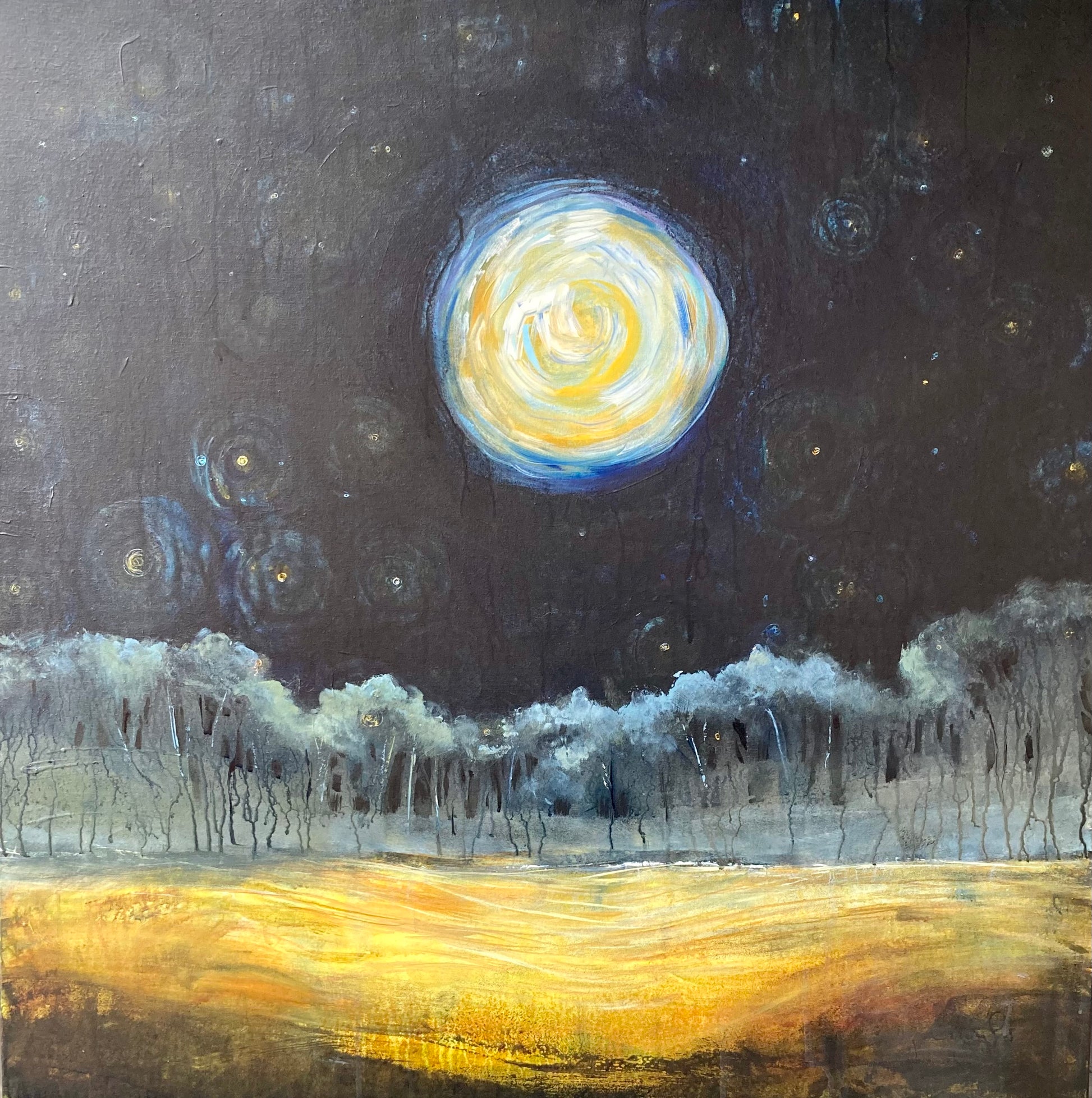 Stargazer is an original night sky inspired painting created on a 36 x 36 inch gallery stretched canvas. With the Perseid meteor shower fresh in my mind and spending a little more time lately looking up to the heavens this painting emerged. The painting is done in acrylic and it has been finished with a satin varnish. The sides are painted dark night sky blue.