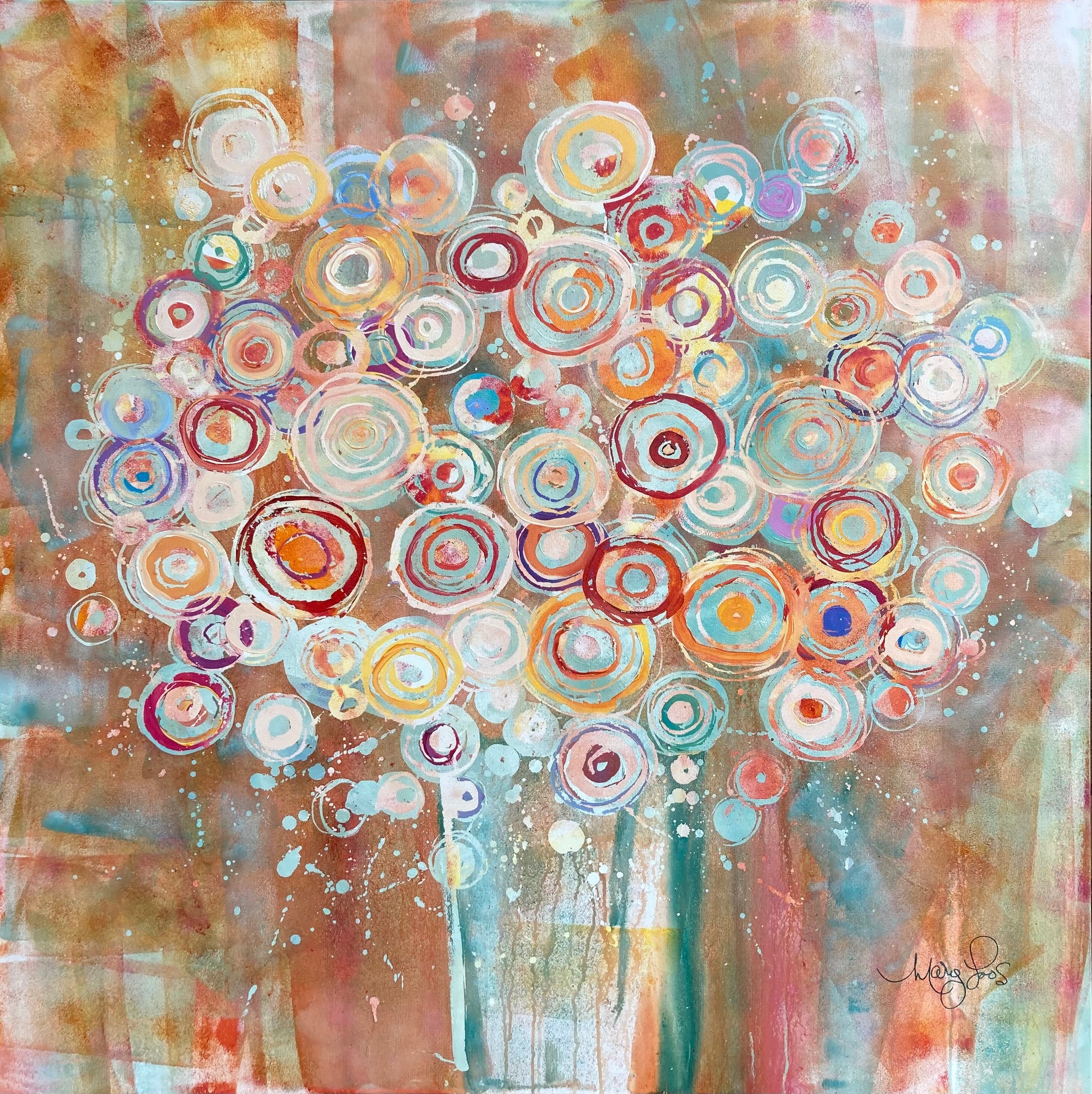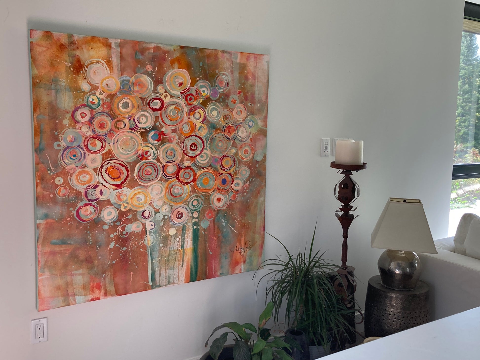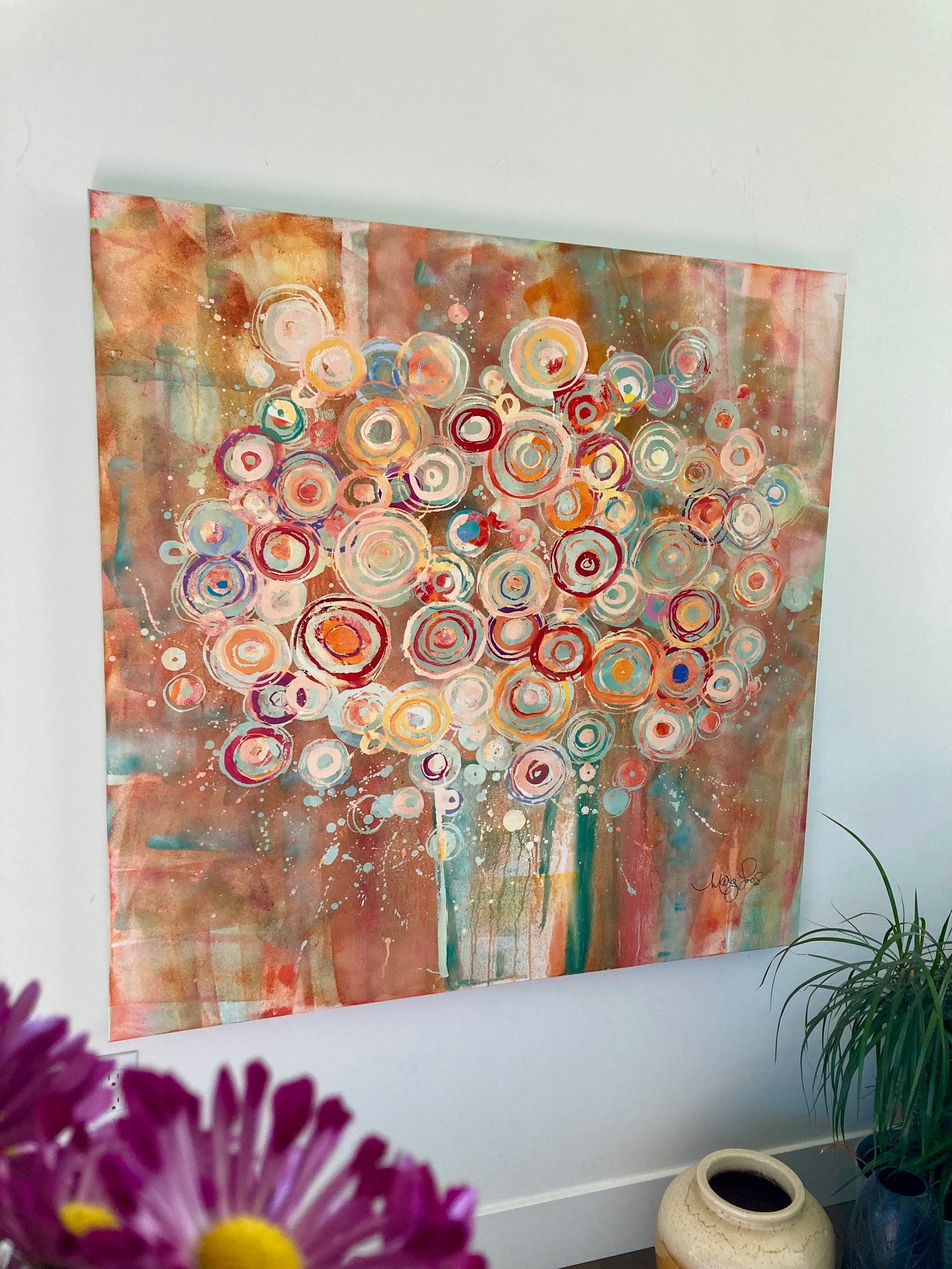 Stay Golden is an expressive floral exploration created with a layered technique in acrylic paint on a 48 x 48 inch stretched gallery canvas. Sorry folks, its pick up only for this very large original painting. I'm unable to deliver or send it by my usual carrier Canada Post. It would make a lovely focal point. See the change in different light in the pictures provided.