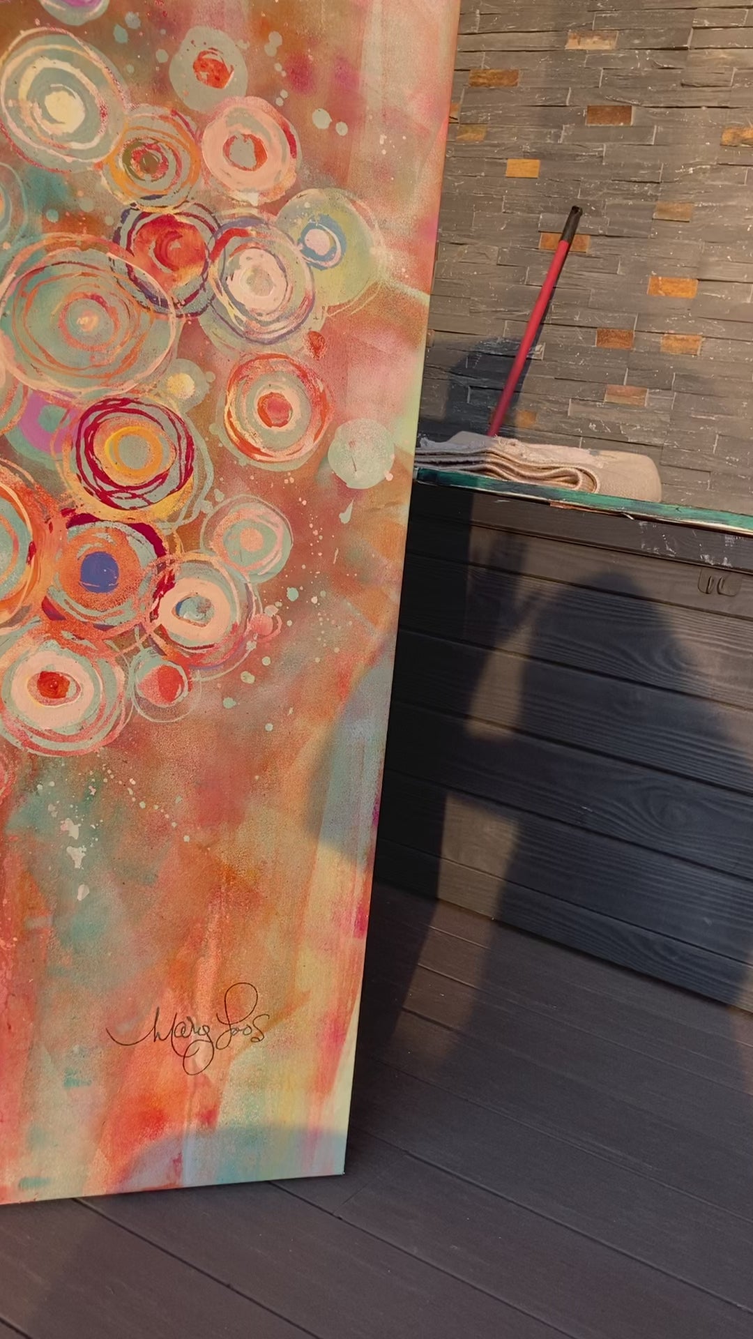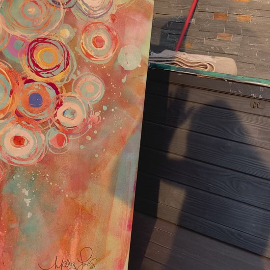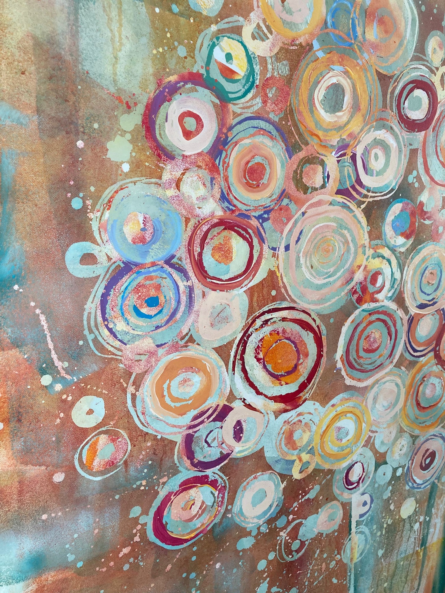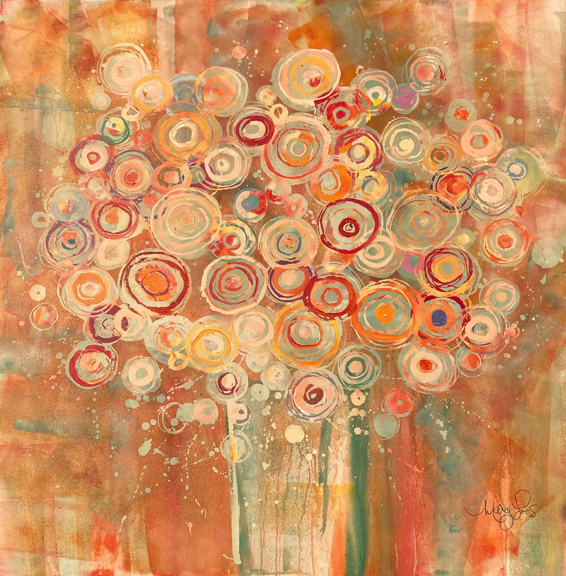 Stay Golden is an expressive floral exploration created with a layered technique in acrylic paint on a 48 x 48 inch stretched gallery canvas. Sorry folks, its pick up only for this very large original painting. I'm unable to deliver or send it by my usual carrier Canada Post. It would make a lovely focal point. See the change in different light in the pictures provided.