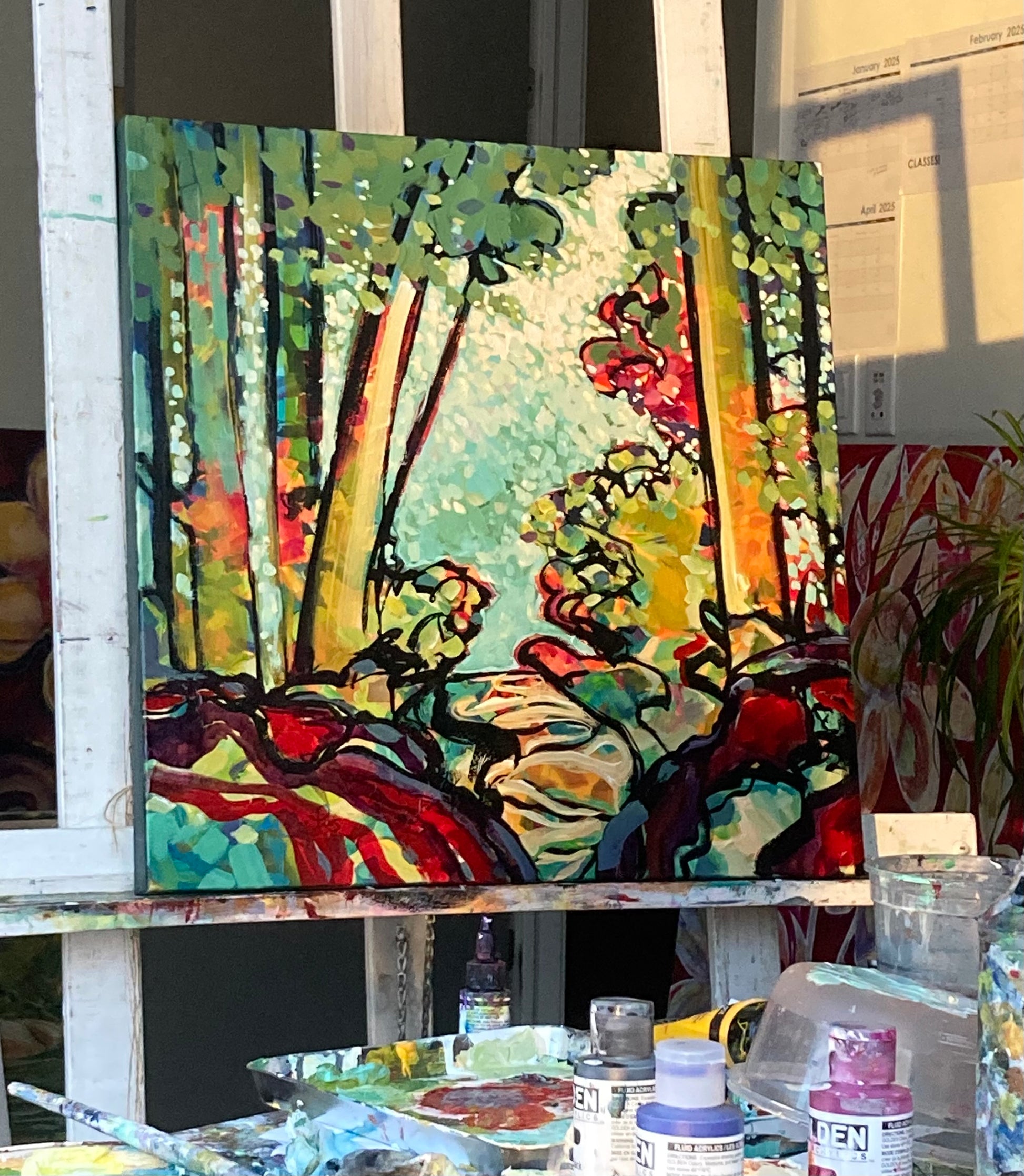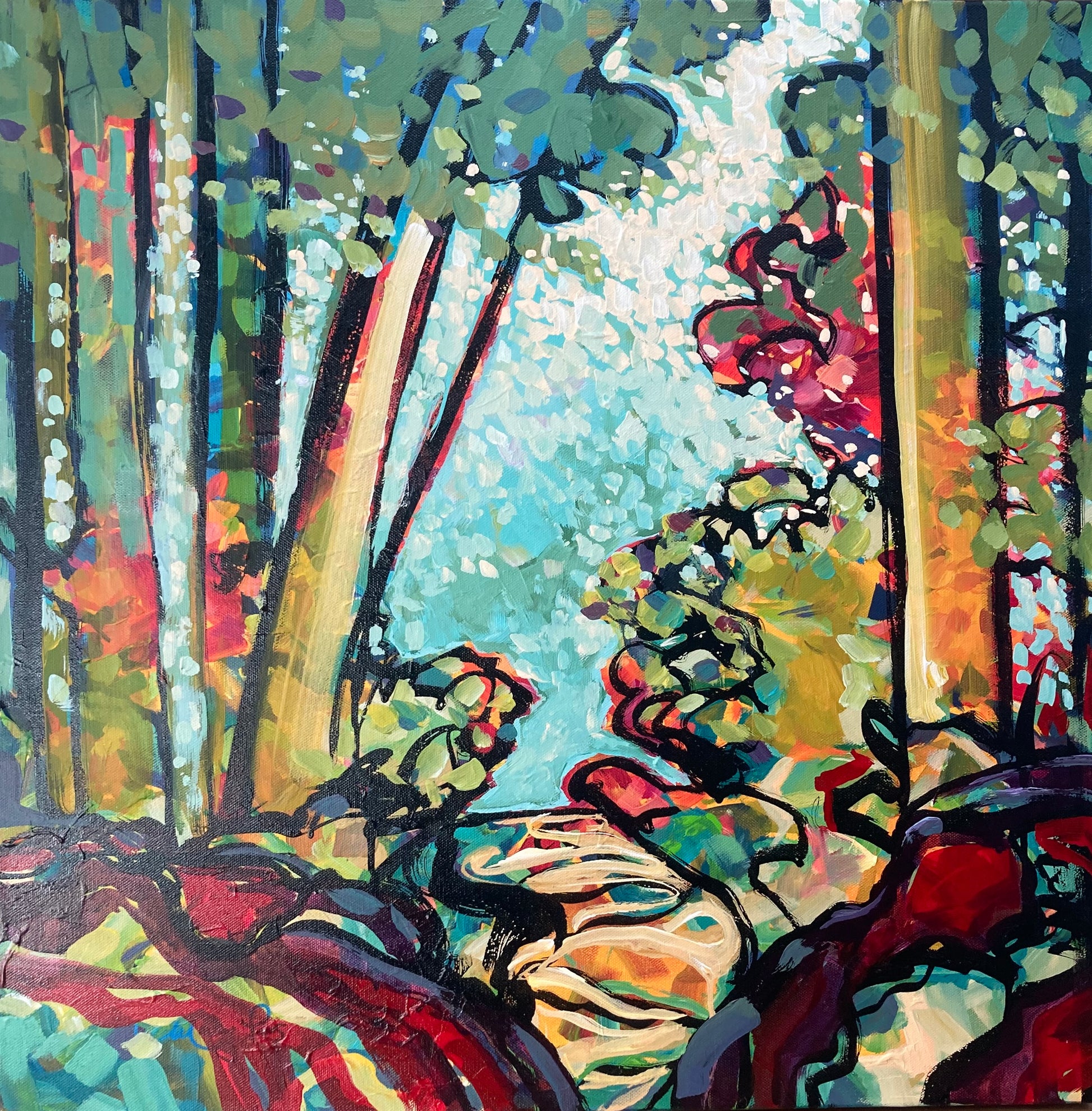 "Sun Charged" is a vibrant landscape painting on a 24 x 24 inch gallery canvas. Painted in an impressionistic style with energetic brush strokes and a love of colour. This nature inspired original will be a bright and positive focal point in your home or office.