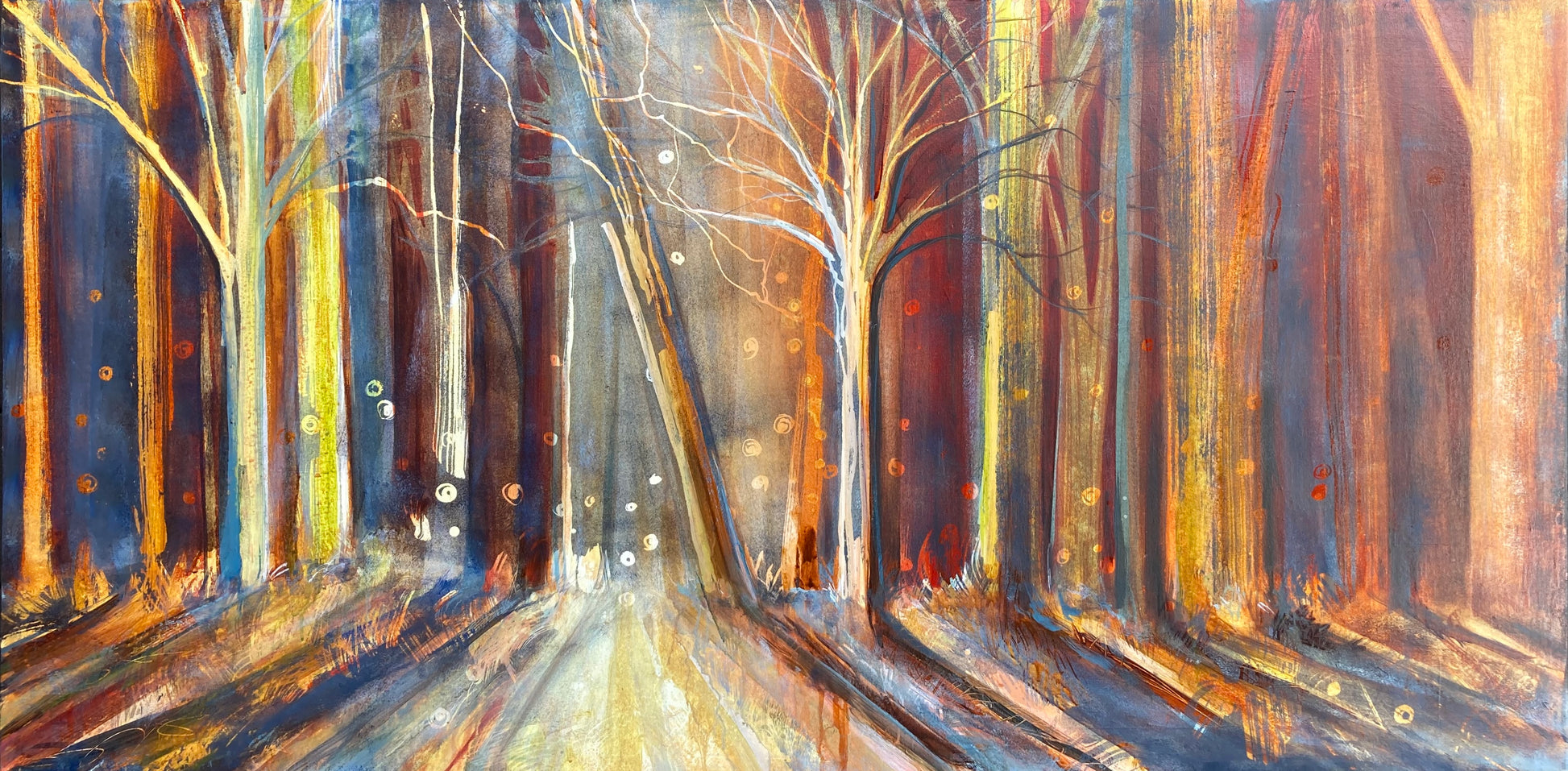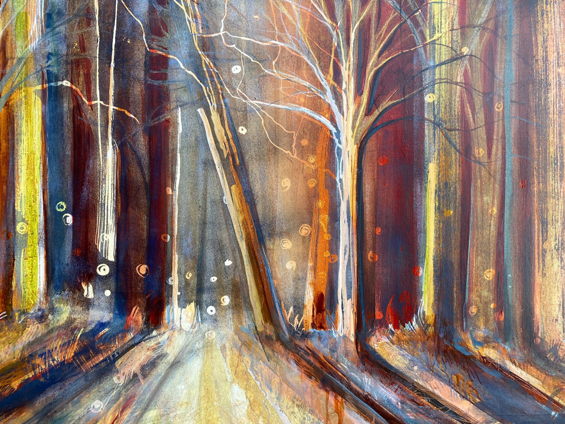 The Golden Age is an enchanting walk through the forest. I was inspired to add the fireflies to this original forest painting after they captured my imagination night after night this year. The evening dog walk became a magical experience as the fields outside lit up with what seemed be an endless blanket of blinking lights. This original 48 x 24 acrylic on stretched gallery canvas brings uplifting light into your home or office. The work is finished with a satin varnish. Shipping is included within Canada.