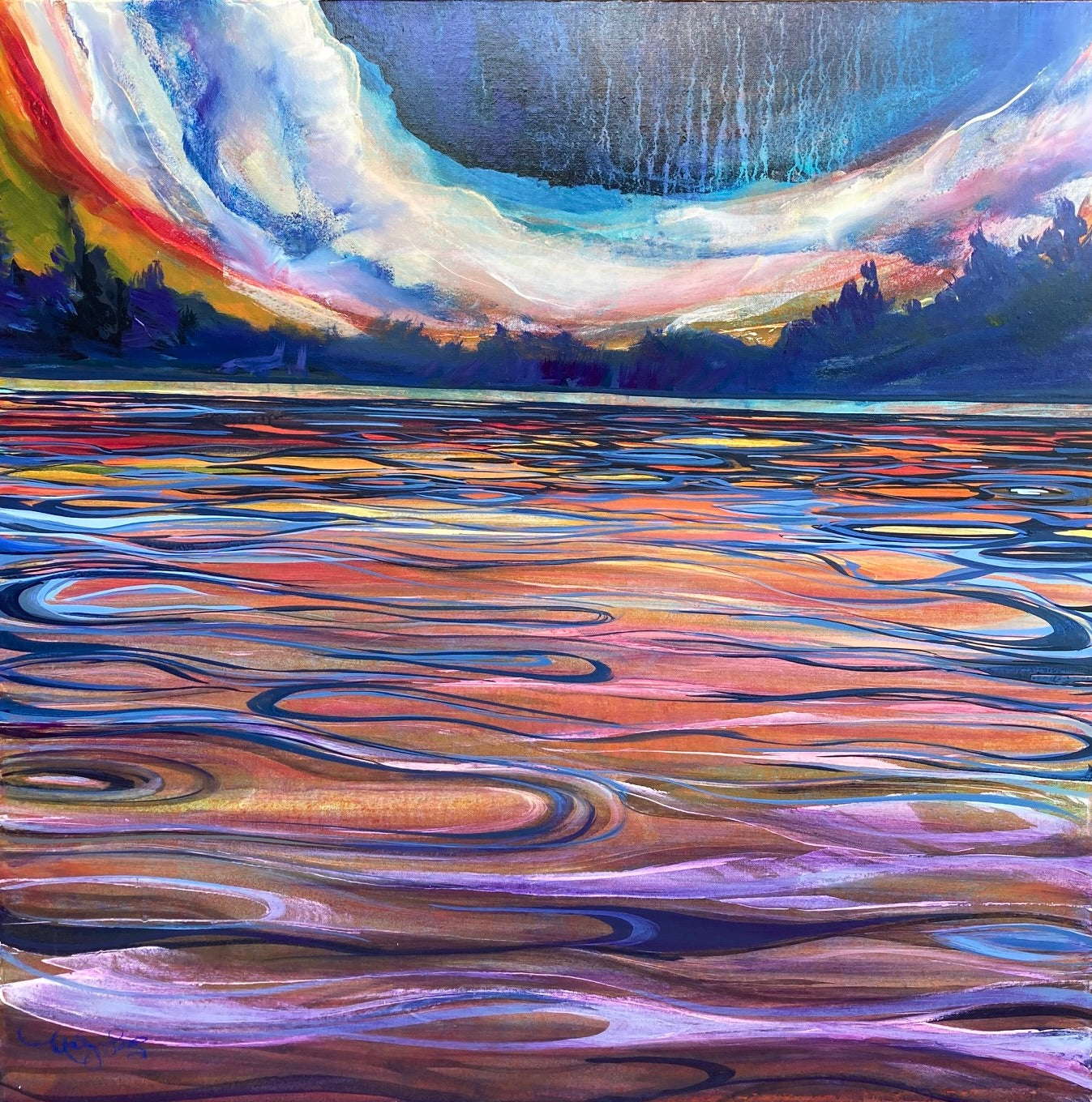 The Light Shines Through in this dramatic original acrylic painting. Layers of colour and movement come together to create a perfect storm of colour and interest in this one of a kind painting.