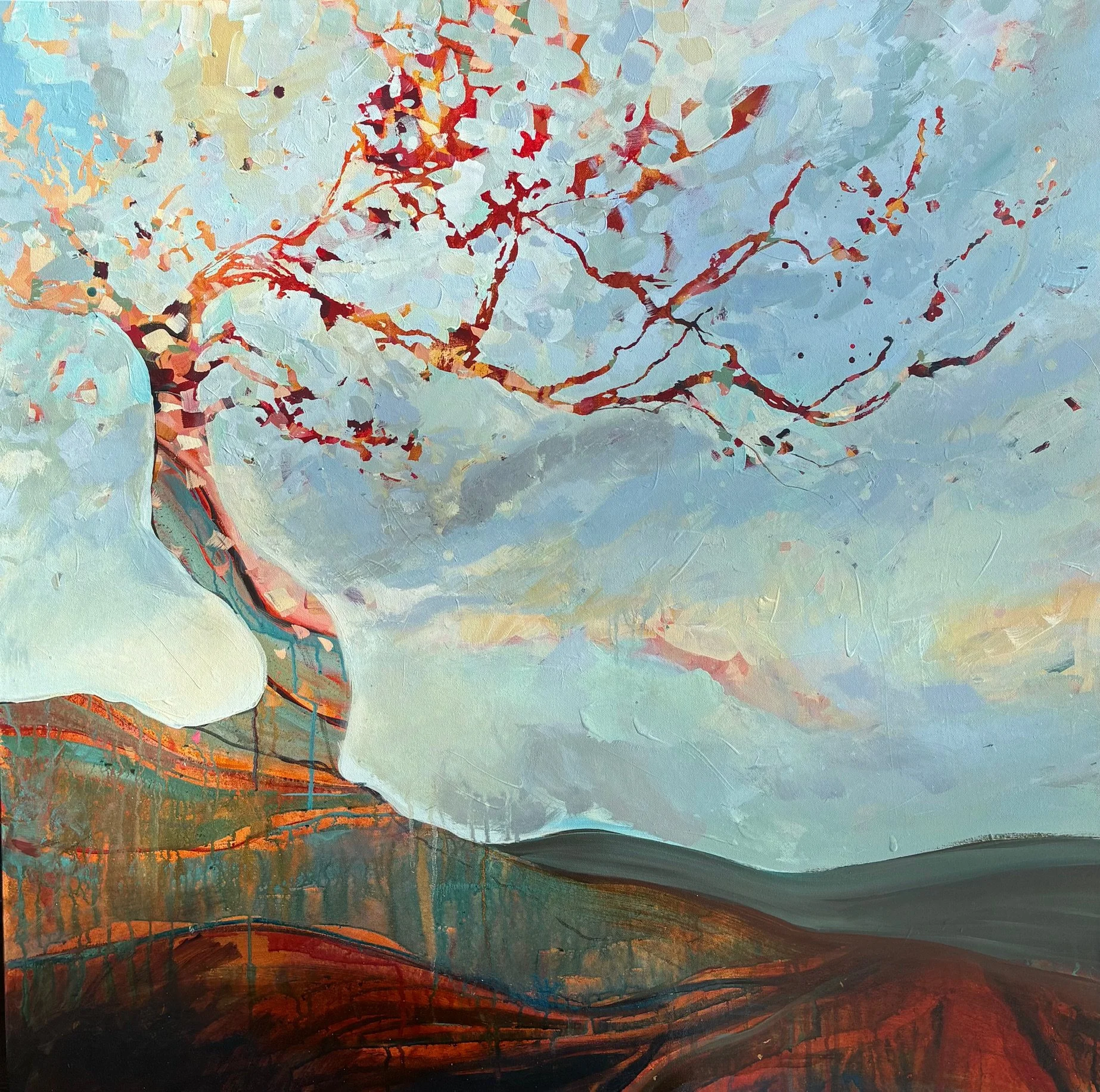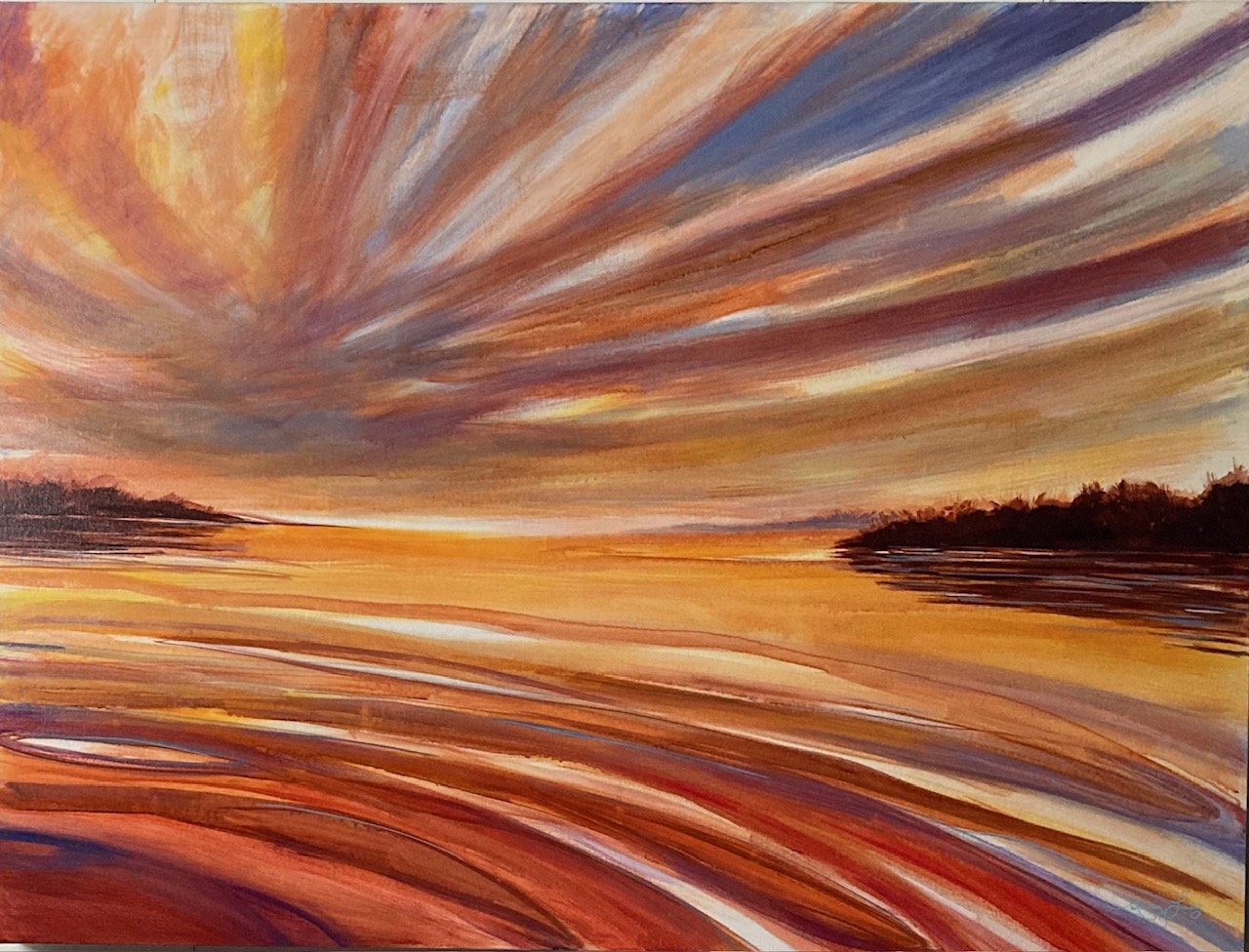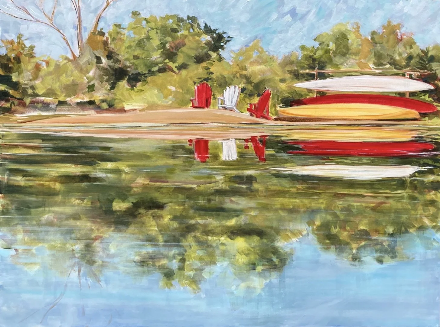 Paddling through these waterways in my kayak, I gather moments and images that become stylized impressions on canvas. The seasons slip into the paintings as well — autumn’s warm reflections and contrast in fields and sky are a favourite subject. I love Ontario’s ever-changing, enchanting palette to draw from.
